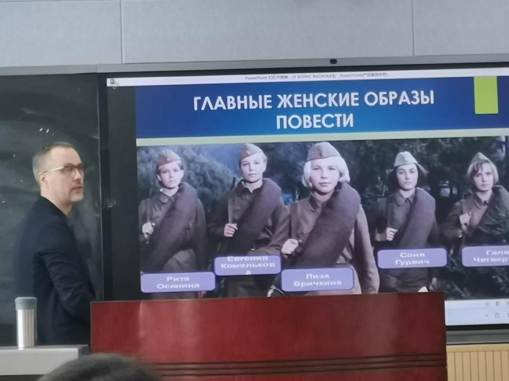 講座中,德米特里以生動(dòng)的語言和豐富的知識(shí),向?qū)W生們介紹了鮑里斯·利沃維奇·瓦西里耶夫的生平經(jīng)歷、文學(xué)成就,以及其代表作的主題和意義。主講人重點(diǎn)分析了作家的成名作《未列入名冊(cè)》和《這里的黎明靜悄悄》。借助視頻和圖片,德米特里幫助學(xué)生們更加直觀地感受到作品中所描繪的場(chǎng)景和人物形象,加深了他們對(duì)瓦西里耶夫文學(xué)世界的認(rèn)識(shí)和理解,了解戰(zhàn)爭(zhēng)的殘酷和蘇聯(lián)人民的英勇。分析作品時(shí)德米特里圍繞小說中的人物和故事情節(jié),與學(xué)生展開問答互動(dòng),同學(xué)們的爭(zhēng)相回答令現(xiàn)場(chǎng)氣氛變得活躍而熱烈。