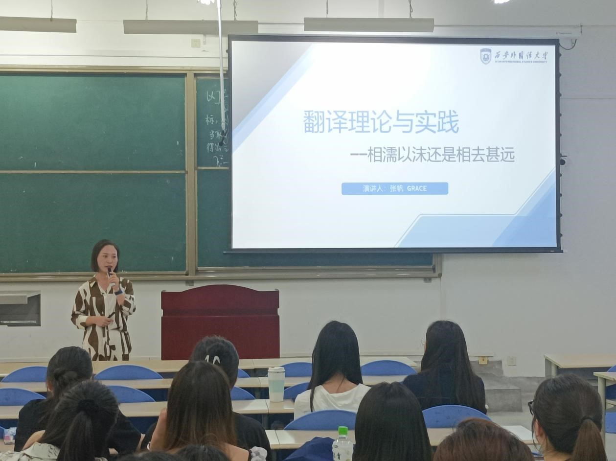 張帆老師以“翻譯理論與實(shí)踐—相濡以沫還是相去甚遠(yuǎn)”為題,結(jié)合自己翻譯研究和翻譯實(shí)踐教學(xué)工作經(jīng)驗(yàn),針對MTI專業(yè)碩士的學(xué)習(xí)和科研工作進(jìn)行了深入淺出的講解。她首先梳理了翻譯理論流派,強(qiáng)調(diào)翻譯理論的功能不僅在于指導(dǎo)翻譯實(shí)踐,還在于對翻譯活動的描述、解釋和預(yù)測。其次,她通過生動的實(shí)際教學(xué)案例,帶領(lǐng)同學(xué)們深入剖析青年研究生在翻譯實(shí)踐中的常見錯誤,建議同學(xué)們在做翻譯實(shí)踐中要提升理論修養(yǎng)和文化自覺意識,不斷錘煉翻譯技能。最后,她結(jié)合自己的翻譯實(shí)踐和教學(xué)經(jīng)驗(yàn),提出了“健忘”“顧盼”“效果”三大翻譯實(shí)踐指導(dǎo)原則和“CCE”的翻譯方法。