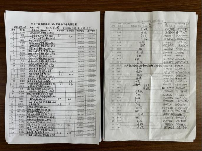 ——嚴(yán)格去向登記制度,加強(qiáng)精細(xì)管理保安全。臨近期末,各年級(jí)輔導(dǎo)員嚴(yán)格落實(shí)請(qǐng)銷假制度,并定期、主動(dòng)與任課教師對(duì)接溝通學(xué)生課堂考勤情況,避免管理出現(xiàn)“真空”。節(jié)前與每位學(xué)生簽訂《電子工程學(xué)院學(xué)生2024年端午假期安全責(zé)任承諾書(shū)》,對(duì)各班學(xué)生端午去向進(jìn)行動(dòng)態(tài)跟蹤。