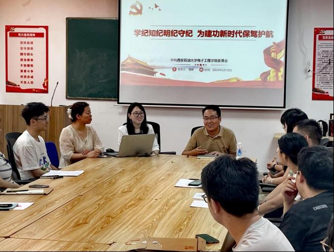 為推進黨紀學(xué)習(xí)教育走深走實,6月18日上午,電子工程學(xué)院黨委書記潘娜在華油能源樓905會議室為我院研究生黨員講授《學(xué)紀知紀明紀守紀為建功新時代保駕護航》黨紀學(xué)習(xí)教育專題黨課。研究生黨支部書記、支部委員、黨員代表60余人參加了黨課學(xué)習(xí)。