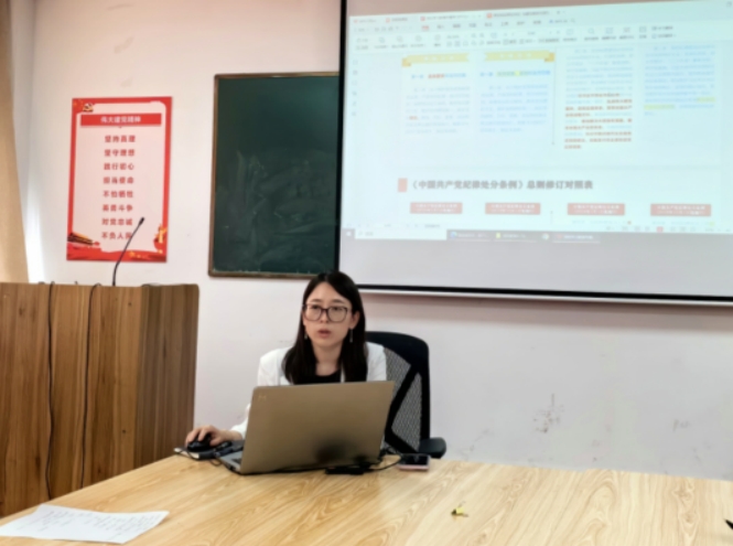課堂上,潘娜以新修訂的《中國共產(chǎn)黨紀律處分條例》為主要內(nèi)容,從《條例》修訂的重要意義、對比《條例》修訂前后條文變化以及《條例》的重點條文解讀等方面進行了詳細解讀。就全體黨員如何進行黨紀學(xué)習(xí),她提出了三點要求,一是牢記黨員身份,嚴守規(guī)矩紀律;二是勇于自我革命,永葆戰(zhàn)斗力;三是砥礪奮進,勇?lián)鷷r代使命。結(jié)合我院工作實際,她希望廣大研究生黨員要領(lǐng)悟黨紀的嚴肅性和重要性,持續(xù)深學(xué)細悟《條例》,把握“六大紀律”的主旨要義和規(guī)定要求,強化紀律意識,加強自我約束。要把遵守黨的紀律貫穿研究生學(xué)習(xí)生活的方方面面,遵守學(xué)術(shù)規(guī)范和道德準則,堅定學(xué)術(shù)信仰和追求,不斷攀登科研高峰。要肩負時代重任,踐行社會責(zé)任,把科研成果應(yīng)用在建設(shè)社會主義現(xiàn)代化強國的偉大事業(yè)中,學(xué)紀知紀明紀守紀,為建功新時代保駕護航。