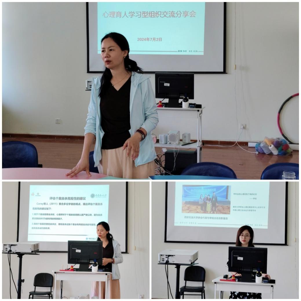 根據(jù)學(xué)生心理成長(zhǎng)指導(dǎo)中心倡導(dǎo)的“一人學(xué)習(xí),眾人受益”原則,每位外出參加會(huì)議或培訓(xùn)的老師,均需在校內(nèi)進(jìn)行分享。2024年7月2日,學(xué)生心理成長(zhǎng)指導(dǎo)中心在鄠邑校區(qū)崇文樓427室舉辦了心理育人學(xué)習(xí)型組織活動(dòng)——“第十六次全國(guó)心理衛(wèi)生學(xué)術(shù)大會(huì)”參會(huì)分享。全體專職心理老師和部分院(系)心理專干老師參加了本次分享交流會(huì)。