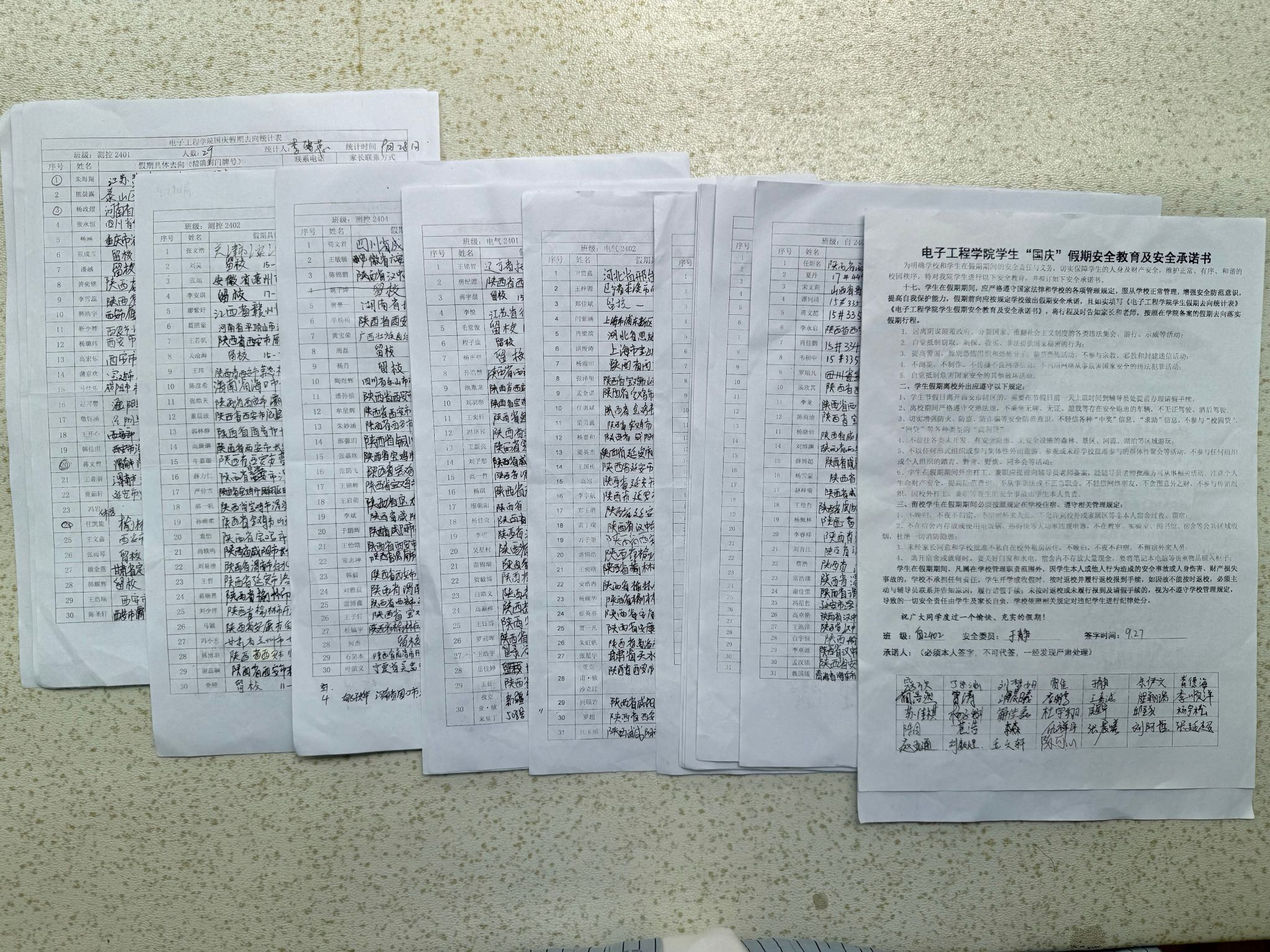 會后,各年級組織簽署了《電子工程學院學生2024年國慶假期安全責任承諾書》和《電子工程學院學生2024年國慶假期去向統(tǒng)計表》。