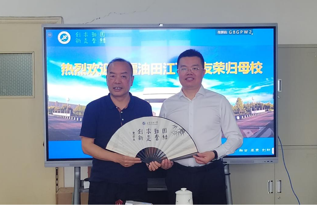 談建勤書(shū)記做了總結(jié)發(fā)言,他期望江飛校友和其他校友一道加強(qiáng)與母校、學(xué)院的聯(lián)系交流,積極促成與母校各項(xiàng)合作業(yè)務(wù)開(kāi)展,不斷拓寬合作領(lǐng)域,共同為油田及母校事業(yè)發(fā)展做出應(yīng)有的貢獻(xiàn)。談建勤還向江飛校友贈(zèng)送了紀(jì)念品。