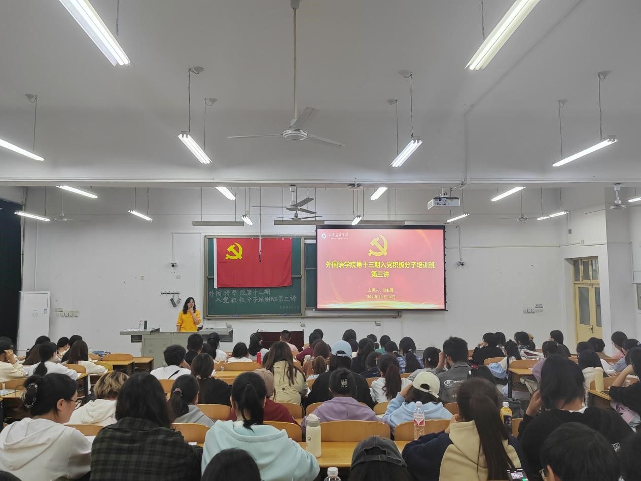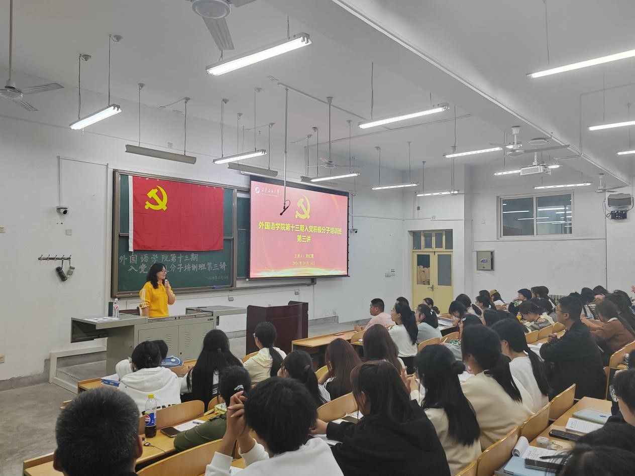 為扎實做好入黨積極分子的培養(yǎng)教育工作,提高入黨積極分子的思想政治素養(yǎng),確保黨員的發(fā)展質(zhì)量。10月16日晚,外國語學院在鄠邑校區(qū)博思樓B114教室舉行第十三期入黨積極分子培訓班第三次集中授課。校黨委研究生工作部部長田虹霞應邀擔任主講。