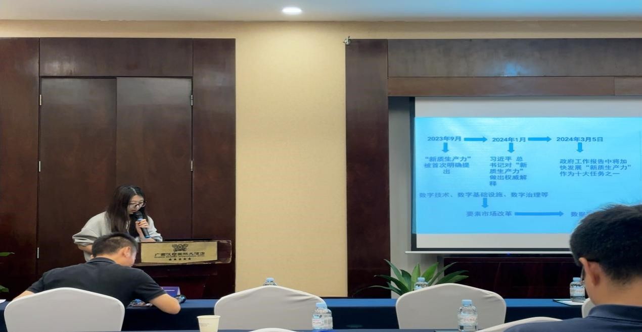 劉姿君同學(xué)作了題為《數(shù)字經(jīng)濟(jì)賦能區(qū)域新質(zhì)生產(chǎn)力發(fā)展:理論分析與實(shí)證檢驗(yàn)》的專題報(bào)告。該報(bào)告基于2012-2022年中國省級(jí)面板數(shù)據(jù),通過構(gòu)建數(shù)字經(jīng)濟(jì)發(fā)展指數(shù)和新質(zhì)生產(chǎn)力指數(shù)實(shí)證檢驗(yàn)數(shù)字經(jīng)濟(jì)對(duì)區(qū)域新質(zhì)生產(chǎn)力的影響,分析了數(shù)字經(jīng)濟(jì)對(duì)新質(zhì)生產(chǎn)力的門檻效應(yīng)。