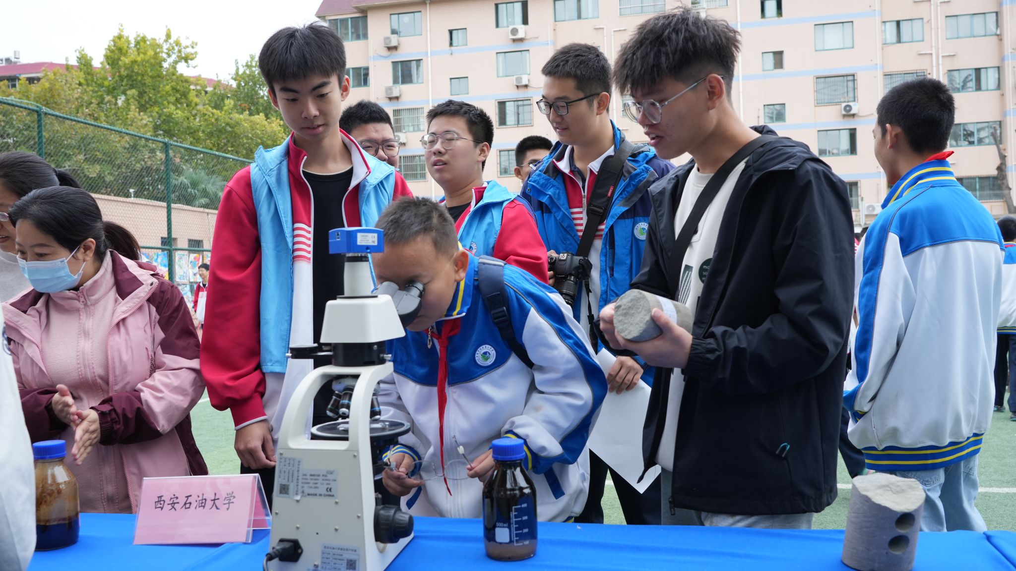 活動現(xiàn)場,科普志愿者正在向同學們講解巖心樣品