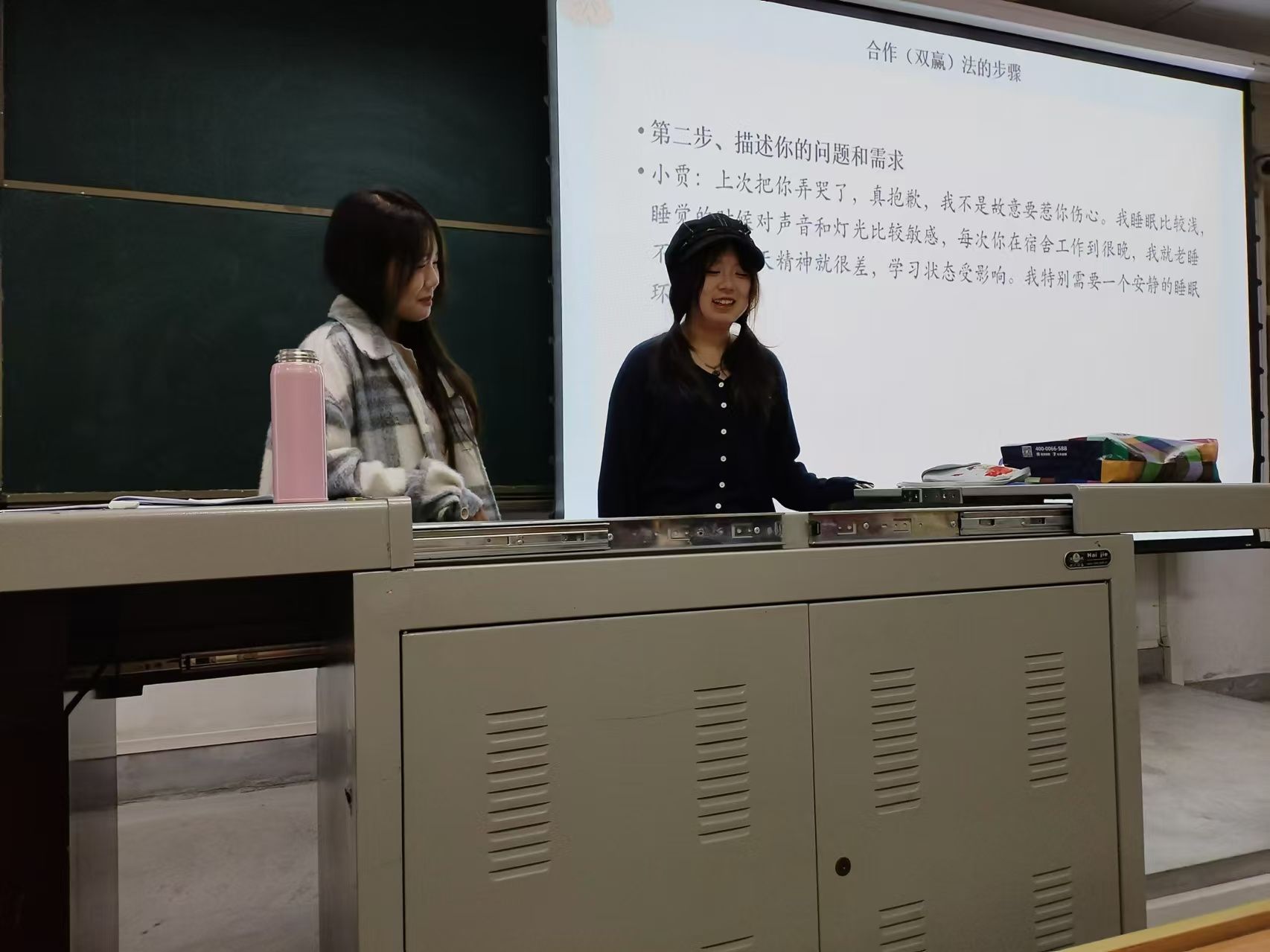 最后,趙老師從心理學(xué)的角度介紹了“知覺檢核”、“枕頭法”以及“合作(雙贏)法”三種應(yīng)對宿舍人際關(guān)系沖突的實用溝通策略,通過情景模擬幫助同學(xué)們更好地理解使用這些方法,并提出要辯證地對待沖突,及時發(fā)現(xiàn)問題并主動溝通,以平和冷靜的態(tài)度解決宿舍矛盾,維護宿舍和諧。