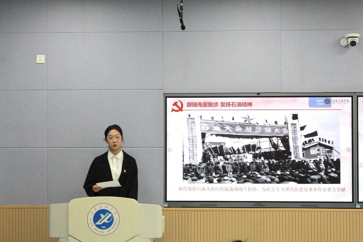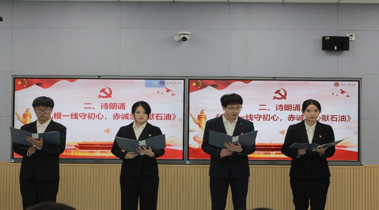活動(dòng)伊始,參會(huì)同志共同唱響《國(guó)際歌》,堅(jiān)定理想信念。隨后,支部?jī)?yōu)秀預(yù)備黨員張晗喆、彭芃、趙嘉博、宋浩婷同志帶來(lái)詩(shī)朗誦,展現(xiàn)在國(guó)家對(duì)能源需求日益增長(zhǎng)的背景下,百萬(wàn)石油工人埋頭苦干,以扎扎實(shí)實(shí)的行動(dòng),實(shí)實(shí)在在的業(yè)績(jī),向黨和國(guó)家交出亮麗成績(jī)單的風(fēng)采。接著與會(huì)同志觀看了石油工程學(xué)院已經(jīng)畢業(yè)的扎根一線的黨員為在校學(xué)弟學(xué)妹精心錄取的寄語(yǔ)視頻,學(xué)習(xí)他們奮戰(zhàn)在萬(wàn)米井場(chǎng)、煉化車間、加油站點(diǎn)等為祖國(guó)的石油事業(yè)默默堅(jiān)守、無(wú)私奉獻(xiàn)的精神。