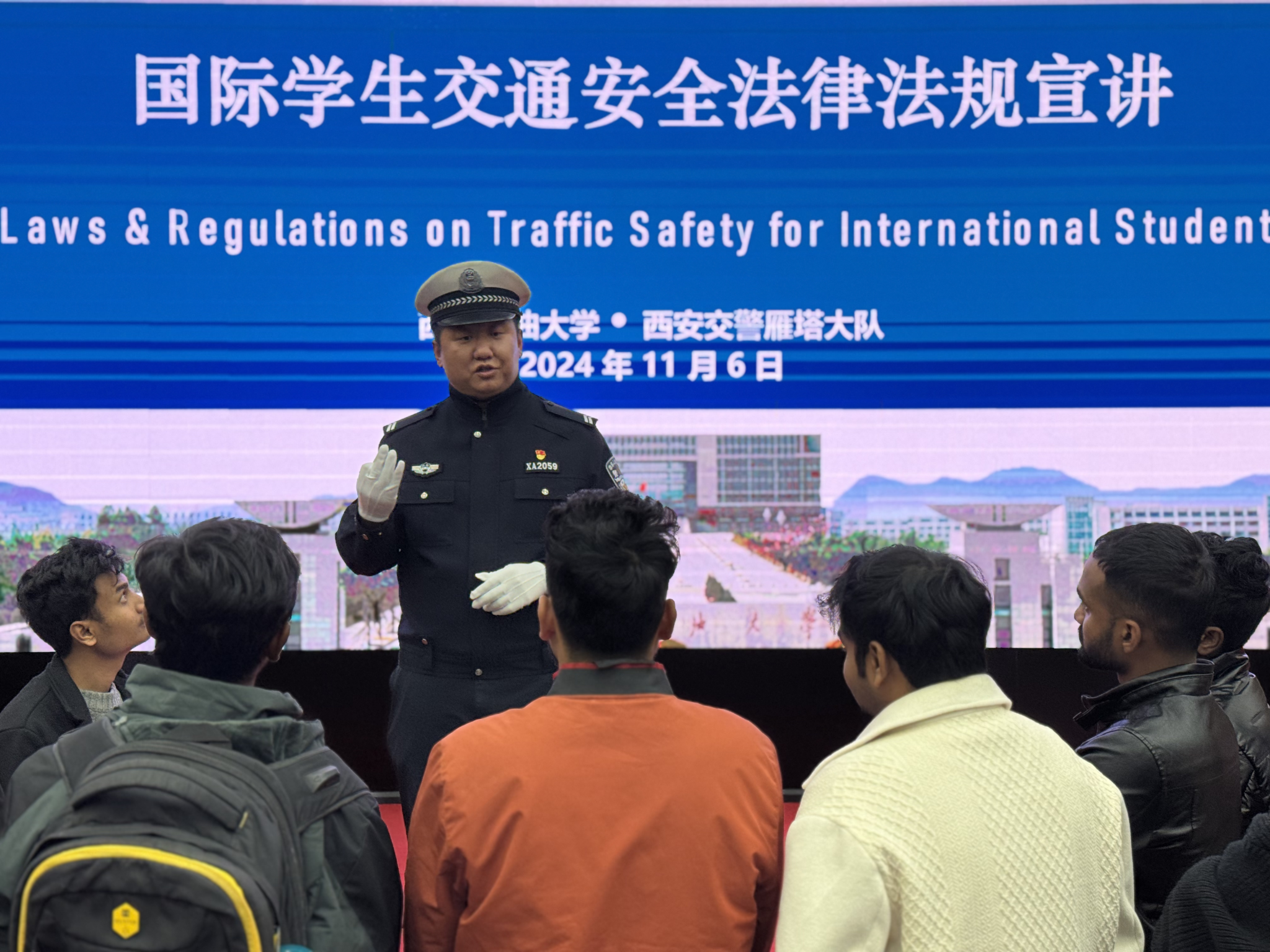 116日下午,國(guó)際教育學(xué)院邀請(qǐng)西安市公安局交警支隊(duì)雁塔大隊(duì)巨雷警官走進(jìn)校園,為我校國(guó)際學(xué)生進(jìn)行道路交通安全法律法規(guī)教育宣講。會(huì)議在雁塔校區(qū)會(huì)議中心學(xué)術(shù)報(bào)告廳舉行,學(xué)院國(guó)際學(xué)生工作辦公室全體輔導(dǎo)員及80余名在校國(guó)際學(xué)生參加。