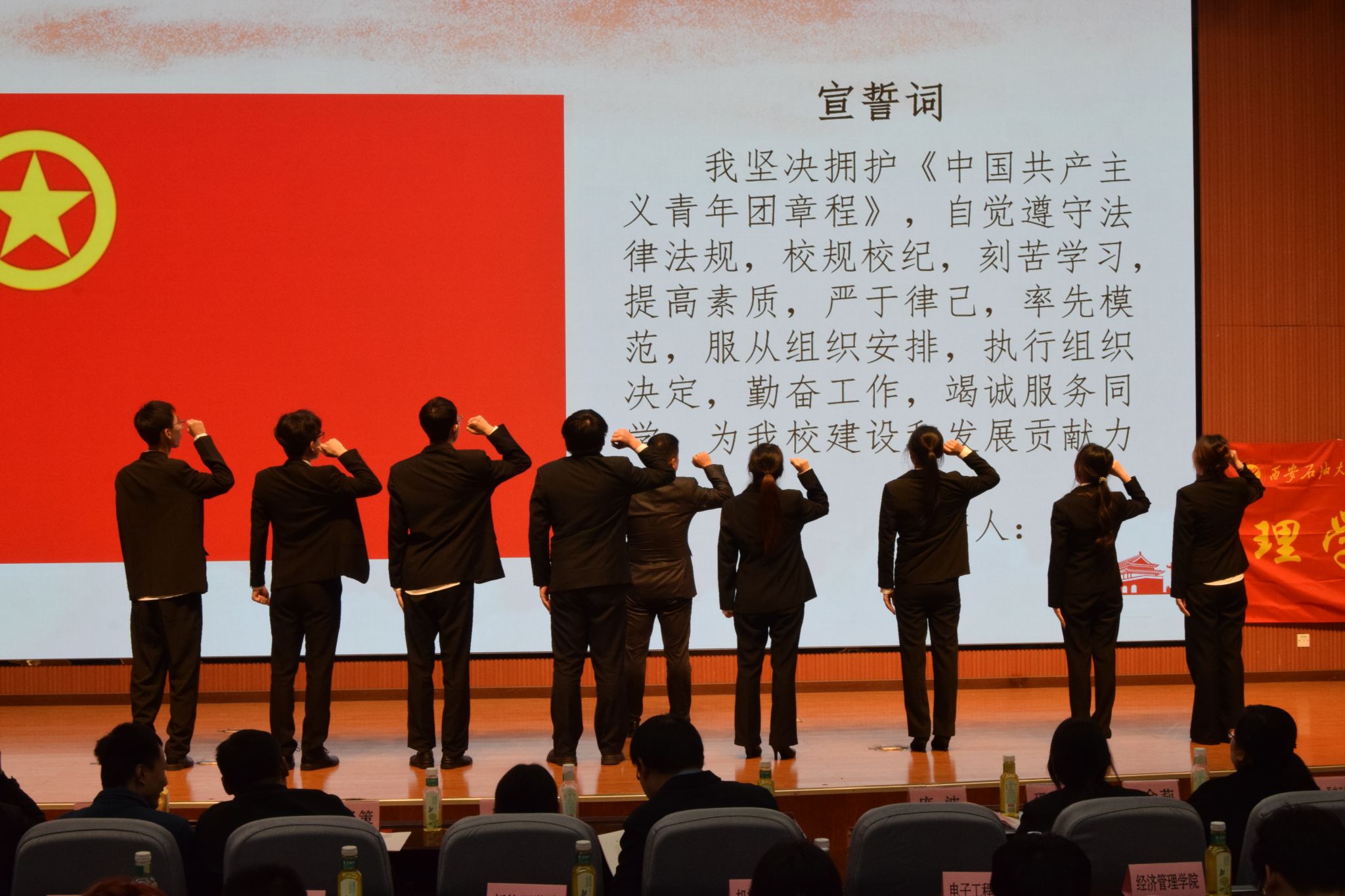 大會通過無記名投票,差額選舉方式順利選舉產生了理學院新任團委委員、新一屆學生委員會委員。理學院團委書記龐波帶領新當選的委員面向國旗莊嚴宣誓就職。