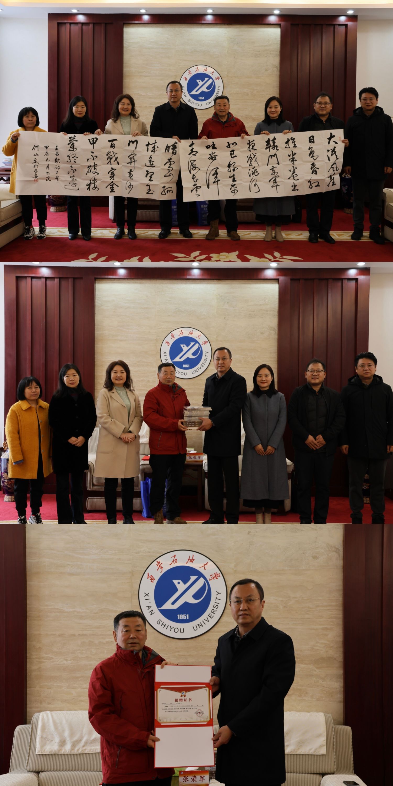 11月19日下午,陜西省社會科學(xué)院研究員、陜西省古籍整理辦公室主任、西北大學(xué)藝術(shù)研究院副院長何炳武先生來校交流,并向?qū)W校圖書館捐贈書法、專著作品。捐贈儀式在我校鄠邑校區(qū)圖書館一樓貴賓室舉行,副校長張榮軍代表學(xué)校會見何炳武先生,圖書館、人文學(xué)院相關(guān)負責(zé)人參加捐贈儀式。