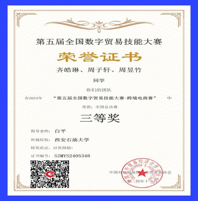 2024年11月20日-11月24日,由中國(guó)對(duì)外貿(mào)易經(jīng)濟(jì)合作企業(yè)協(xié)會(huì)主辦,南京步驚云軟件有限公司承辦的“第五屆全國(guó)數(shù)字貿(mào)易技能大賽跨境電商賽項(xiàng)”成功舉辦。來(lái)自全國(guó)217所本科、高職、中職院校的3592支隊(duì)伍共計(jì)10776人參加了比賽,其中中職組232支隊(duì)伍,選手696人;高職組1251支隊(duì)伍,選手3753人;本科組2109支隊(duì)伍,選手6327人。經(jīng)過(guò)五天的激烈角逐,由白平老師指導(dǎo)的1支參賽隊(duì)伍在本次比賽中榮獲全國(guó)三等獎(jiǎng)。