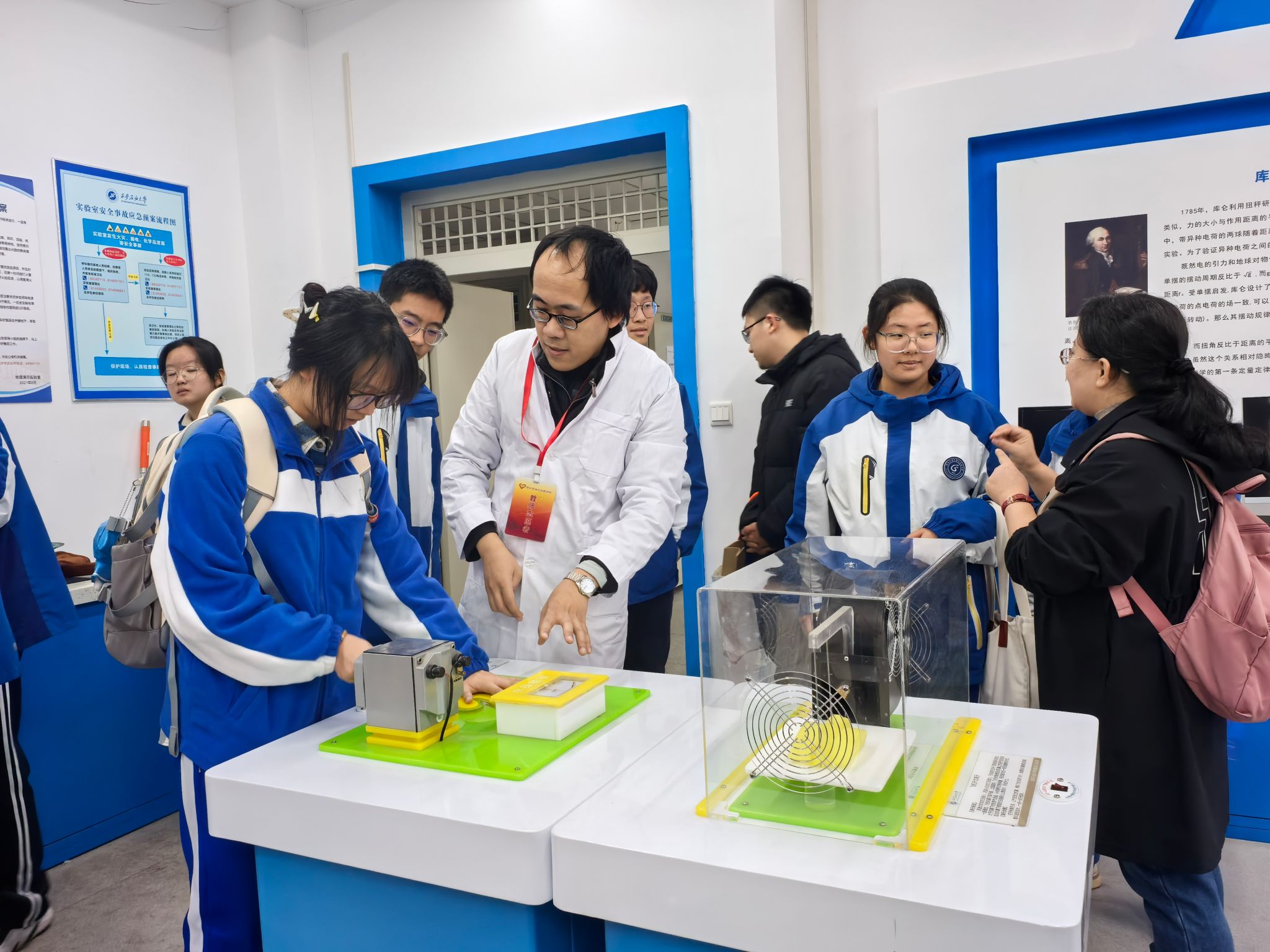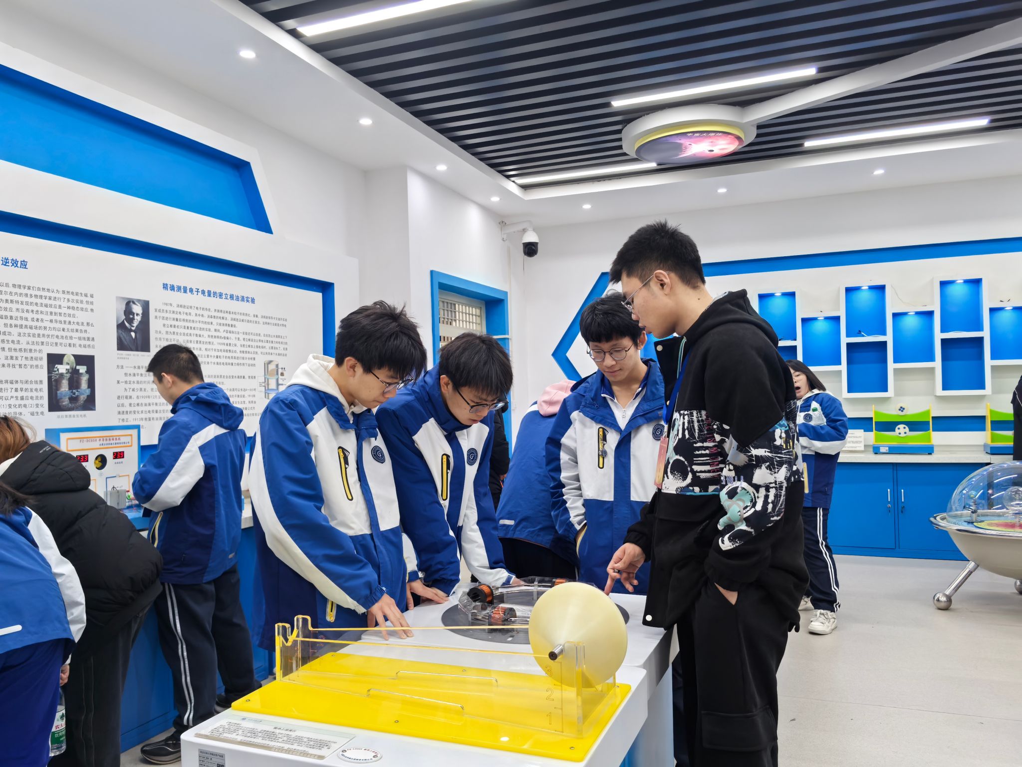 研學活動第二站來到理學院物理演示實驗室。物理演示實驗室是陜西省科普教育基地,是集圖像演示、實物操作等功能為一體的開放性實驗室,涵蓋了力學、電磁學、光學、熱學等方面知識。理學院師生志愿者分組帶領五高師生進入實驗室,逐一演示了引人入勝的雅各布天梯,生動展現(xiàn)了電流的神秘躍動等,讓參觀者直觀感受到能量轉換的奇妙過程;震撼人心的電磁炮發(fā)射,以直觀、震撼的方式詮釋了電磁力的強大威力。這些精心設計的演示活動,不僅激發(fā)了學生對物理學奧秘的好奇心與探索欲,更為大家搭建起了一座通往科學殿堂的橋梁,讓物理之美躍然眼前,深入人心。