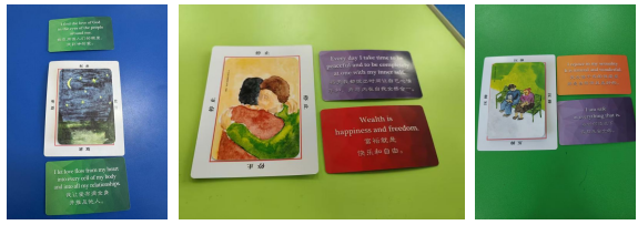 本次活動主題為“卡牌心橋—與自己對話”,意在通過歐卡牌讓同學(xué)們更深入、更直觀地感受到自身心理映射和情緒體驗(yàn),并通過交流分享,助力大家避免壓抑、開放身心。活動開始,同學(xué)們隨機(jī)分為三個(gè)小組,李夏凝讓每位同學(xué)以動物自比,幫助大家初步了解個(gè)人性格和特質(zhì)。隨后,進(jìn)行歐卡牌團(tuán)訓(xùn),同學(xué)們分四次分別抽取彩虹卡、圖卡、字卡、彩虹卡,并圍繞卡牌內(nèi)容、選擇理由、自身感受等進(jìn)行分享。最后,李夏凝邀請有分享意愿的同學(xué)進(jìn)行發(fā)言,講述自身體會,并以此為衍伸,鼓勵同學(xué)們在生活中要敢說、想說、多說,及時(shí)表達(dá)自我,避免因憋悶、鉆牛角尖等形成不好的情緒體驗(yàn)。整個(gè)活動氛圍親切、溫馨,同學(xué)們紛紛表示體驗(yàn)感極佳,也通過本次活動在一些問題上有了新的認(rèn)識,更清楚了內(nèi)心深處的想法。