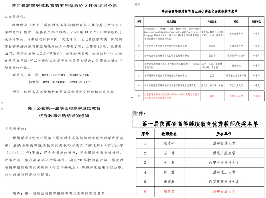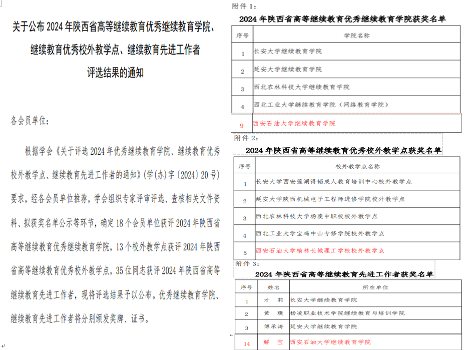 近日,在陜西省教育廳指導(dǎo)下、陜西省高等繼續(xù)教育學(xué)會組織實施的兩年一次的各類評比評選中,我校繼續(xù)教育工作獲得多項榮譽表彰。在“2024年陜西省高等繼續(xù)教育優(yōu)秀繼續(xù)教育學(xué)院、繼續(xù)教育優(yōu)秀校外教學(xué)站點、繼續(xù)教育先進工作者”評選中,我校繼續(xù)教育學(xué)院(培訓(xùn)中心)榮獲“陜西省高等繼續(xù)教育優(yōu)秀繼續(xù)教育學(xué)院”,我校榆林長城理工學(xué)校校外教學(xué)點獲得“陜西省繼續(xù)教育優(yōu)秀校外教學(xué)站點”,繼續(xù)教育學(xué)院(培訓(xùn)中心)解寶榮獲“陜西省高等繼續(xù)教育先進工作者”稱號;在“陜西省高等繼續(xù)教育第五屆優(yōu)秀論文”評選中,繼續(xù)教育學(xué)院(培訓(xùn)中心)解寶獲得優(yōu)秀論文二等獎;在“陜西省第一屆高等繼續(xù)教育優(yōu)秀教師”評選中,馬克思主義學(xué)院郭艷英榮獲“陜西省高等繼續(xù)教育優(yōu)秀教師”稱號。