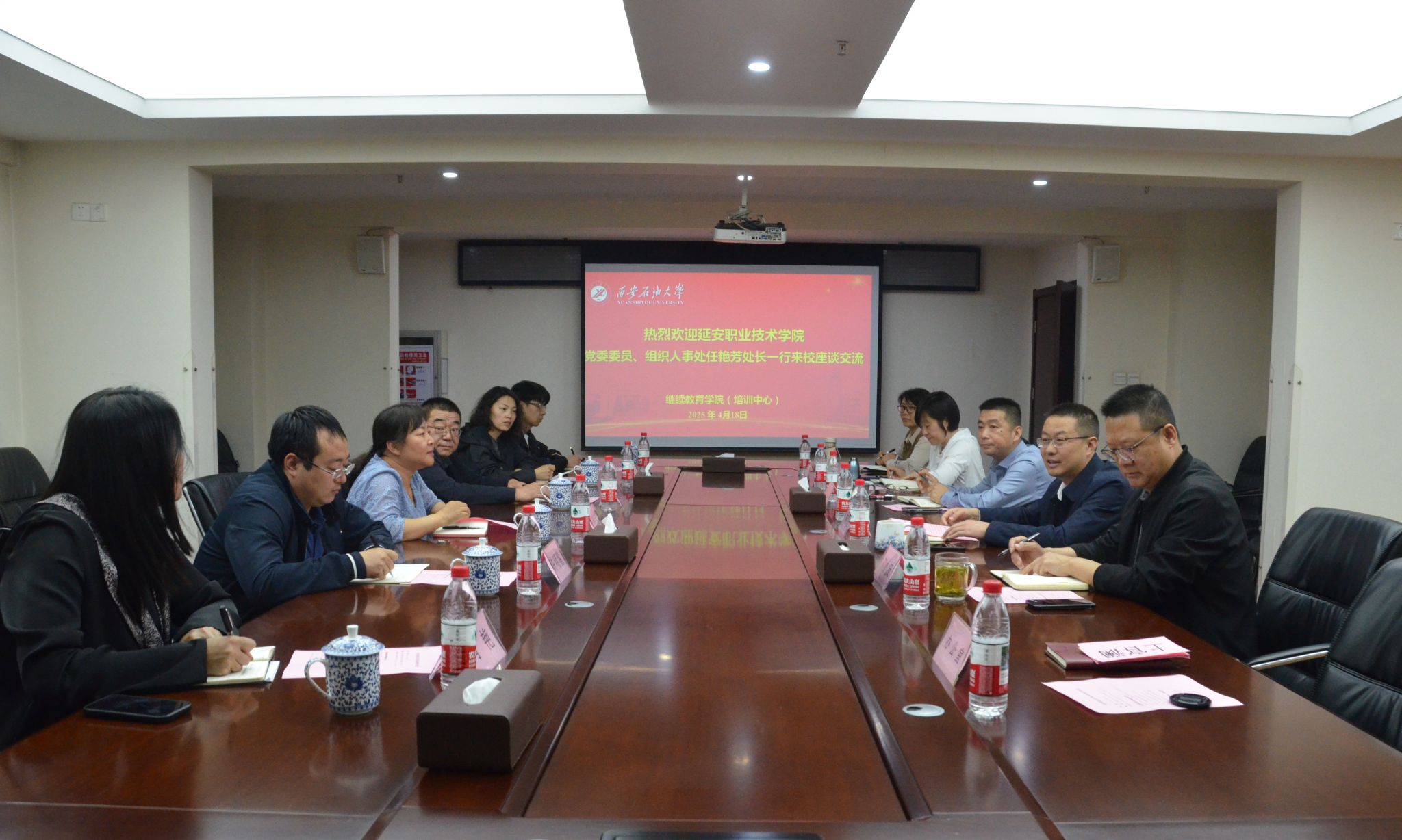 為共同推動繼續(xù)教育事業(yè)發(fā)展,加強(qiáng)校際間的合作與交流,4月18日下午,延安職業(yè)技術(shù)學(xué)院黨委委員、組織人事處處長(統(tǒng)戰(zhàn)部部長)任艷芳、繼續(xù)教育學(xué)院院長惠延?xùn)|等一行6人來我校繼續(xù)教育學(xué)院(培訓(xùn)中心)座談交流,就學(xué)歷教育、培訓(xùn)教育、同等學(xué)力申碩等方面進(jìn)行了深入的交流。