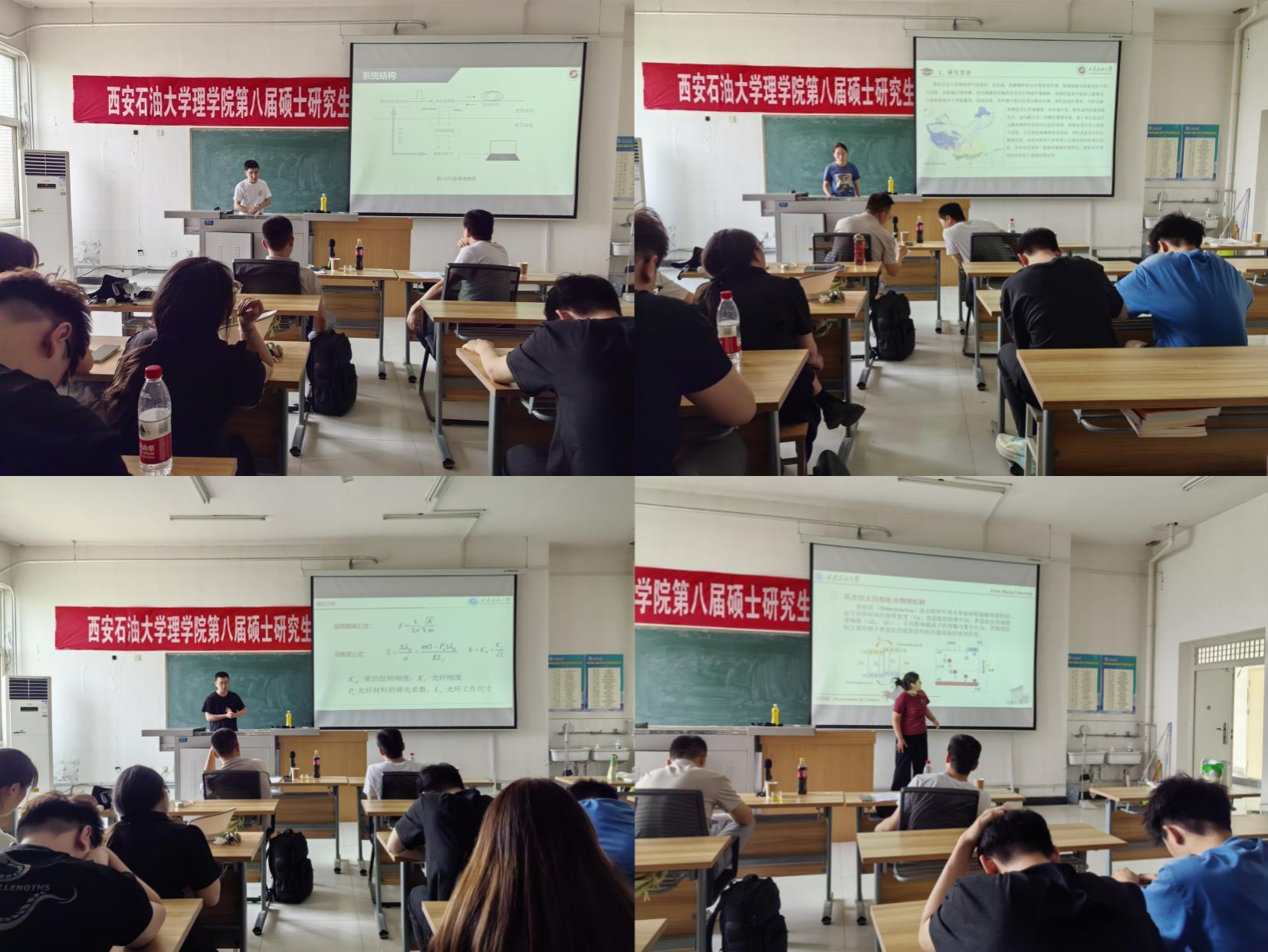 隨后,50位研究生分別就“短時傅立葉變換的原理和應(yīng)用”、“激光陀螺儀精確追蹤地球自轉(zhuǎn)”、“柔性壓力傳感器的結(jié)構(gòu)與性能研究”、“光纖側(cè)面集成超表面的二氧化氮濃度監(jiān)測技術(shù)研究”、“環(huán)形激光干涉儀測量地球自轉(zhuǎn)速率變化”、“基于光纖光柵(FBG)傳感的凍土路基監(jiān)測相關(guān)技術(shù)原理”等50個學(xué)術(shù)專題進行了交流分享。在本次分享會上,各位同學(xué)們圍繞著自己的研究課題,講述了自己的研究方向、方法及結(jié)果分析等方面,讓同學(xué)們深入了解了各個領(lǐng)域的研究進展。