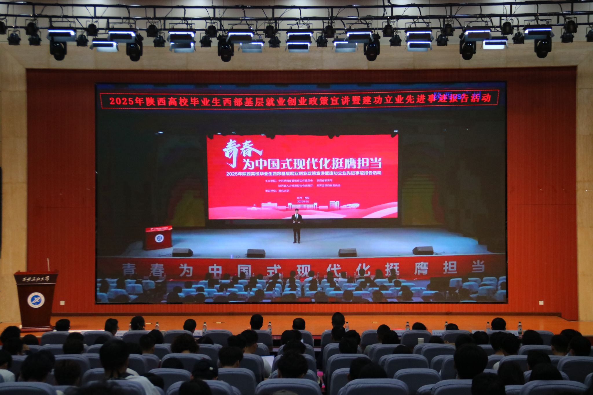 5月29日下午,2025年陜西高校畢業(yè)生西部基層就業(yè)創(chuàng)業(yè)政策宣講暨建功立業(yè)先進事跡報告活動省級報告會在西北大學舉辦。中共陜西省委教育工委副書記王海波、共青團陜西省委員會副書記惠旋、陜西省人才交流中心副主任李陽出席報告會。我校在鄠邑校弘石學術報告廳設立分會場,副校長趙健,黨委學生工作部、校團委、各院(系)主管學生工作負責人、輔導員代表及學生代表400余人參加了報告會。