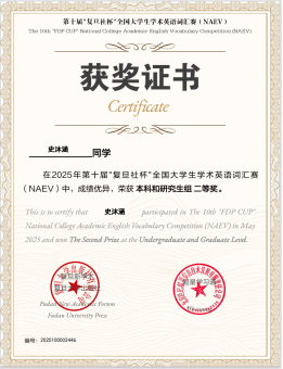 近日,第十屆“復(fù)旦社杯”全國大學生學術(shù)英語詞匯賽(The10th“FDPCup”CollegeAcademic English Vocabulary Competition)圓滿落幕。我校胡佳美、喻越、石銳東等25名同學榮獲一等獎,梁旗凱、楊晨曦、史沐涵等25位同學獲得二等獎,張晨萱、鄧文杰、任依婷等39位同學獲得三等獎。