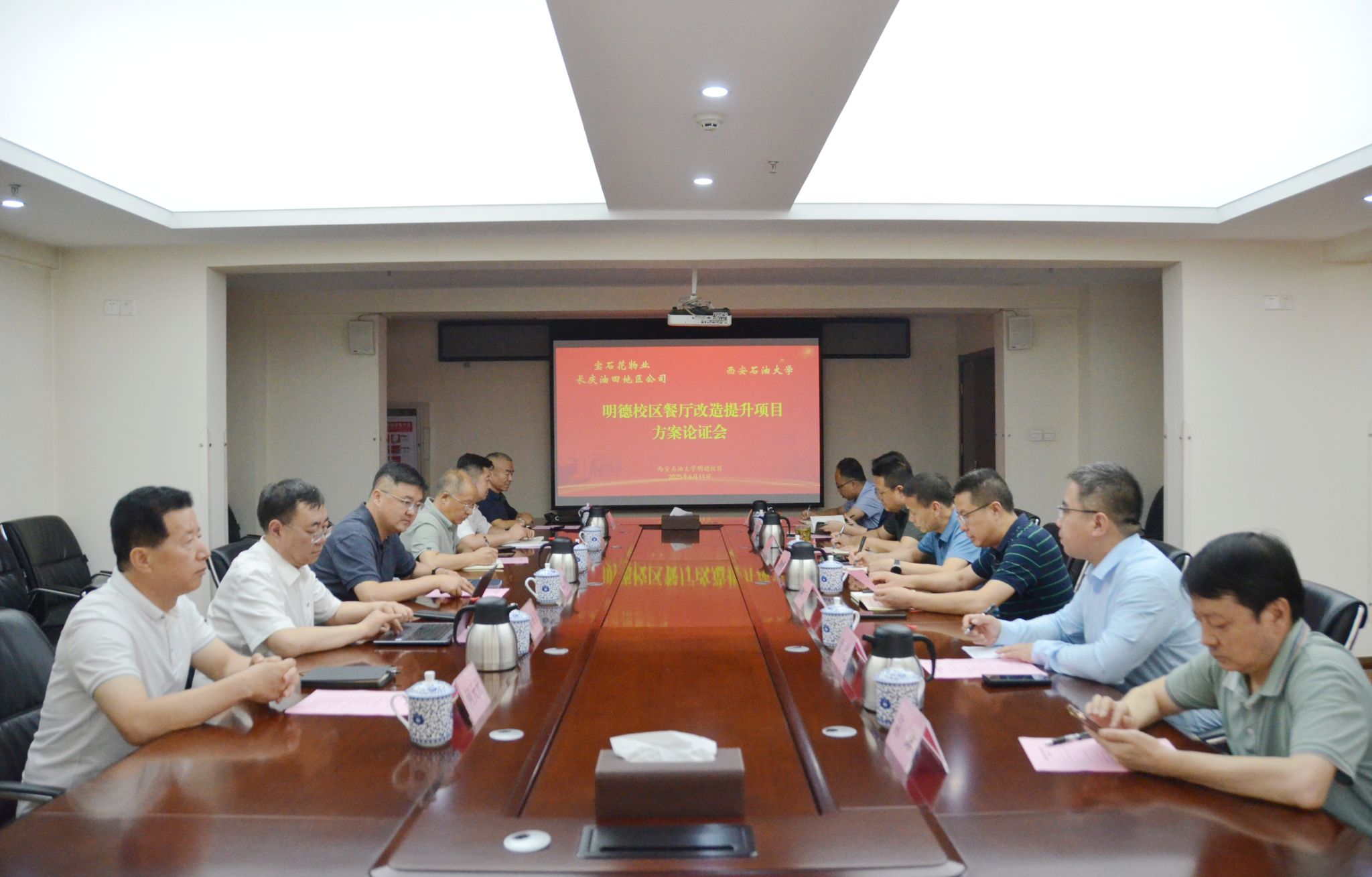 6月11日下午,學(xué)校與寶石花物業(yè)長慶油田地區(qū)公司在明德校區(qū)召開“明德校區(qū)餐廳改造提升項目”方案論證會,雙方圍繞項目設(shè)計方案進行深入研討,進一步優(yōu)化功能布局。寶石花物業(yè)長慶油田地區(qū)公司市場部總監(jiān)王恒、運營部工程管理主任李建寧等6人,我校研究生工作部、后勤處、國際教育學(xué)院及繼續(xù)教育學(xué)院負(fù)責(zé)人參加會議。會議由繼續(xù)教育學(xué)院(培訓(xùn)中心)院長(主任)林紅先主持。