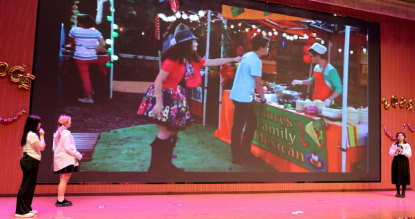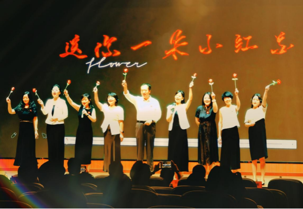 本次匯報演出共24個節(jié)目,分別由《英語電影賞析》《英語歌曲與英語文化》《中國文化推介》《跨文化交際視聽說》《英漢翻譯技巧與實踐》和《實用英語寫作》6門大學英語拓展課程的同學及教師參演。節(jié)目異彩紛呈,涵蓋了電影配音、拓展課程介紹、歌曲演唱、英語話劇、跨文化情景劇短視頻、舞蹈、相聲等多種形式。在本次課程匯演的舞臺上,外國語學院第一教學部拓展課程組教師溫情獻唱,致敬成長,傾情演繹歌曲《送你一朵小紅花》。他們從講臺走向舞臺,用溫暖而真摯的歌聲傳遞著對莘莘學子的關愛與期許。這首飽含鼓勵與祝福的旋律,在師生心中播撒下溫暖與力量,成為匯演中一抹動人的亮色,生動詮釋了和諧融洽、積極向上的校園文化氛圍與教育溫度。