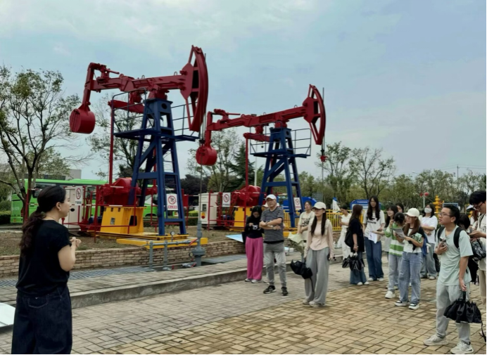 6月18日,全體學(xué)生來到長慶油田西安油氣綜合實(shí)訓(xùn)基地,開啟“外語+石油”實(shí)踐教學(xué)。在油田實(shí)訓(xùn)區(qū),學(xué)生通過模擬鉆井平臺(tái)、抽油機(jī)等設(shè)備觀摩石油開采全流程;氣田實(shí)訓(xùn)區(qū)的天然氣凈化裝置模型前,技術(shù)人員用中英雙語講解井口作業(yè)原理。實(shí)訓(xùn)中,學(xué)生在油氣加工區(qū)觀察蒸餾塔模型演示原油提煉,于鉆井作業(yè)區(qū)觸摸真實(shí)鉆桿部件,更在數(shù)字化培訓(xùn)室通過智能監(jiān)控系統(tǒng)模擬操作英語指令?;貏?chuàng)新創(chuàng)效展室的員工技術(shù)成果展示,讓學(xué)生深度感受石油行業(yè)的創(chuàng)新文化與實(shí)踐精神,實(shí)現(xiàn)語言能力與能源行業(yè)知識(shí)的跨界融合。