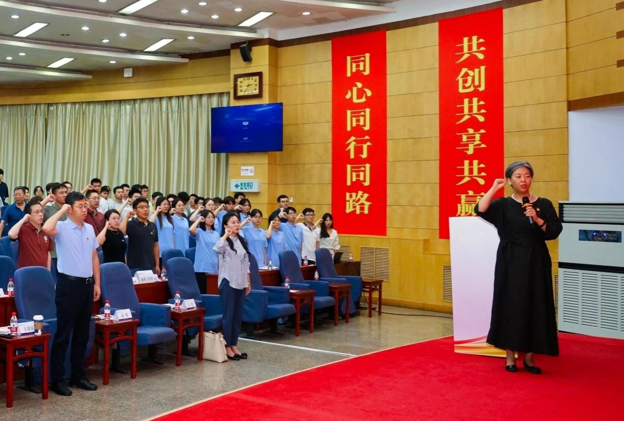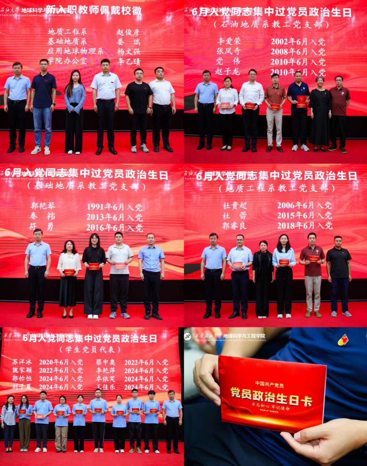 學(xué)院副院長(zhǎng)沈鴻雁宣讀學(xué)院新入職教師名單。學(xué)院院長(zhǎng)宋立軍等與會(huì)領(lǐng)導(dǎo)為新進(jìn)教師佩戴校徽,象征教育薪火相傳。在集中過(guò)政治生日環(huán)節(jié),校院領(lǐng)導(dǎo)與各系黨支部書(shū)記、主任為6月入黨的師生黨員代表頒發(fā)黨員政治生日卡,進(jìn)一步強(qiáng)化身份認(rèn)同,激發(fā)使命擔(dān)當(dāng)。