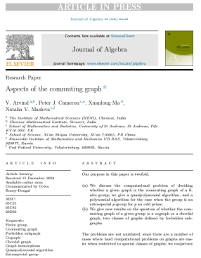 發(fā)表在Journal of Algebra的論文“Aspects of the commuting graph”主要研究了有限群的交換圖,全文共61頁(yè),作者順序按姓氏字母排列,依次為印度欽奈數(shù)學(xué)研究所V. Arvind教授、英國(guó)圣安德魯斯大學(xué)Peter J. Cameron教授、理學(xué)院馬儇龍副教授及俄羅斯科學(xué)院烏拉爾分院克拉索夫斯基數(shù)學(xué)和力學(xué)研究所首席研究員Natalia V. Maslova教授。群上交換圖的研究最早起源于1955年,本文系統(tǒng)探討了判定給定圖是否為有限群上交換圖的算法問(wèn)題,且針對(duì)超特殊p-群(p為奇素?cái)?shù)),給出了多項(xiàng)式算法。此外,就“分類交換圖是余圖或弦圖時(shí)所對(duì)應(yīng)的有限群”這一公開問(wèn)題進(jìn)行了深入研究;特別地,分類了交換圖為余圖時(shí)的所有有限單群。該工作得到了國(guó)家自然科學(xué)基金項(xiàng)目的大力支持和資助。