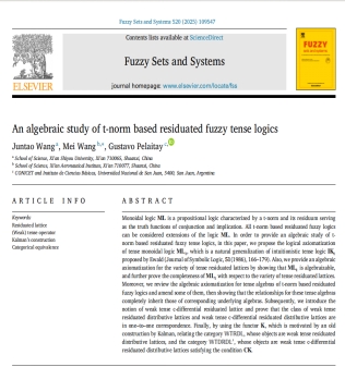 發(fā)表在Fuzzy Sets and System的論文“An algebraic study of t-norm based residuated fuzzy tense logics”主要研究了基于三角模的剩余模糊時(shí)態(tài)邏輯的代數(shù)理論,理學(xué)院王軍濤副教授為論文的第一作者,西安石油大學(xué)理學(xué)院為論文的第一署名單位。1986年,著名邏輯學(xué)家W.B. Ewald在論文[Intuitionistic tense and modal logic, Journal ofSymbolicLogic,51 (1986)]中構(gòu)建了直覺時(shí)態(tài)邏輯的公理系統(tǒng)IKt.本文指出了IKt并非是獨(dú)立的,在此基礎(chǔ)之上構(gòu)建了基于三角模剩余模糊時(shí)態(tài)邏輯的公理化系統(tǒng),并從泛代數(shù)角度通過(guò)語(yǔ)義擴(kuò)張形式構(gòu)建了基于三角模剩余模糊時(shí)態(tài)邏輯的代數(shù)語(yǔ)義體系,進(jìn)而為剩余模糊時(shí)態(tài)邏輯提供了統(tǒng)一的代數(shù)處理框架,同時(shí)從范疇角度找到了時(shí)態(tài)剩余格范疇的等價(jià)范疇,得到了其一種簡(jiǎn)易化的表示性定理。