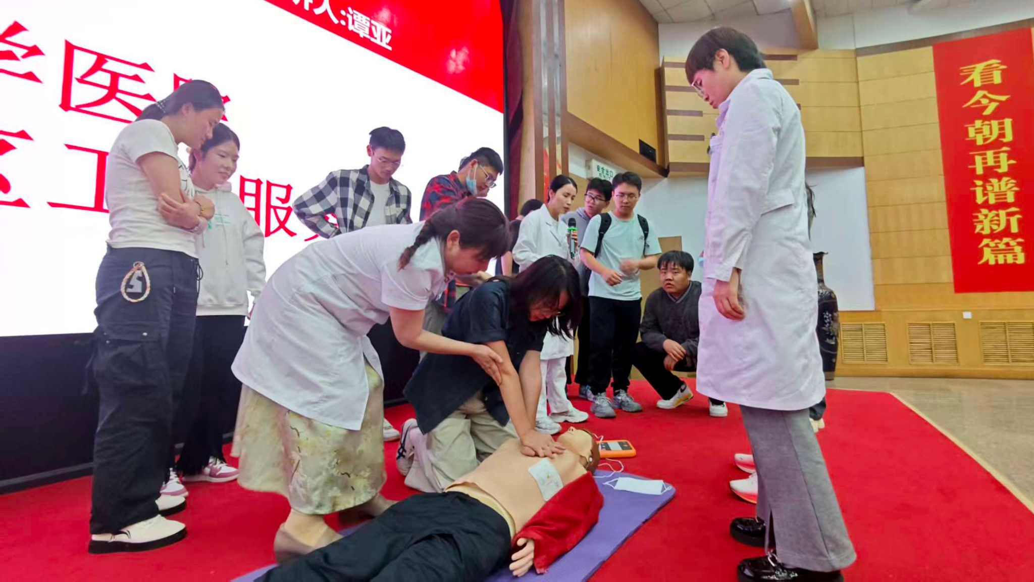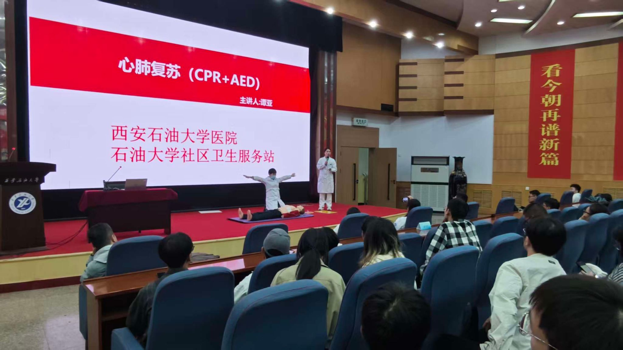 為助力2025級研究生安全平穩(wěn)適應(yīng)大學(xué)環(huán)境,提升健康防護意識與突發(fā)事件應(yīng)對能力,積極響應(yīng)第三批急救校園建設(shè)的號召,9月17日,研究生工作部、校醫(yī)院攜手雁塔區(qū)疾病預(yù)防控制中心,在雁塔校區(qū)西階學(xué)術(shù)報告廳開展了傳染病防治講座、醫(yī)保政策科普、應(yīng)急救護培訓(xùn)系列活動。本次活動由校醫(yī)院預(yù)防保健科負責(zé)人洪艷萍和急救負責(zé)人伍曉燕主持。