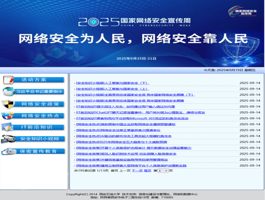 2025年9月15日至21日,西安石油大學圍繞“網(wǎng)絡(luò)安全為人民,網(wǎng)絡(luò)安全靠人民——以高水平安全守護高質(zhì)量發(fā)展”主題,組織開展第十二屆國家網(wǎng)絡(luò)安全宣傳周系列活動。此次活動嚴格落實陜西省教育廳《2025 年陜西省教育系統(tǒng)第十二屆國家網(wǎng)絡(luò)安全宣傳周活動實施方案》要求,深入宣傳貫徹習近平總書記關(guān)于網(wǎng)絡(luò)強國的重要思想及“四個堅持”重要指示精神,普及網(wǎng)絡(luò)安全領(lǐng)域法律法規(guī),全面提升廣大師生網(wǎng)絡(luò)安全意識與防護能力。我校信息化建設(shè)與管理處會同宣傳部、學生工作部、保衛(wèi)部等部門組織開展了豐富多彩的網(wǎng)絡(luò)安全周宣傳活動,具體活動如下: