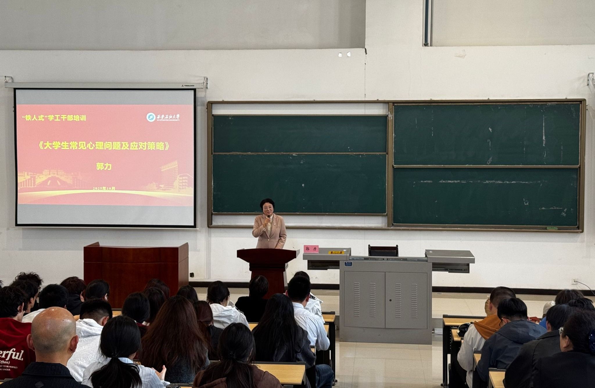為進(jìn)一步提升學(xué)工干部心理健康服務(wù)專業(yè)知識(shí),筑牢我校“校級(jí)--院系--班級(jí)--生活園區(qū)--師生個(gè)體”五級(jí)心理危機(jī)防控暨心理健康教育網(wǎng)絡(luò)體系,1015學(xué)生工作部邀請(qǐng)我校特聘心理咨詢顧問、空軍軍醫(yī)大學(xué)第一附屬醫(yī)院心身科副主任醫(yī)師郭力鄠邑校區(qū)石工地科樓115開展“鐵人式”學(xué)工干部心理健康專題培訓(xùn)講座。各院系學(xué)工干部、心理成長(zhǎng)指導(dǎo)中心老師、院系班級(jí)心理委員代表、大學(xué)生心理協(xié)會(huì)學(xué)生代表、學(xué)生代表,及保衛(wèi)干部、樓管等后勤人員代表200余人參加。培訓(xùn)由學(xué)生工作部副部長(zhǎng)畢軼慧主持。