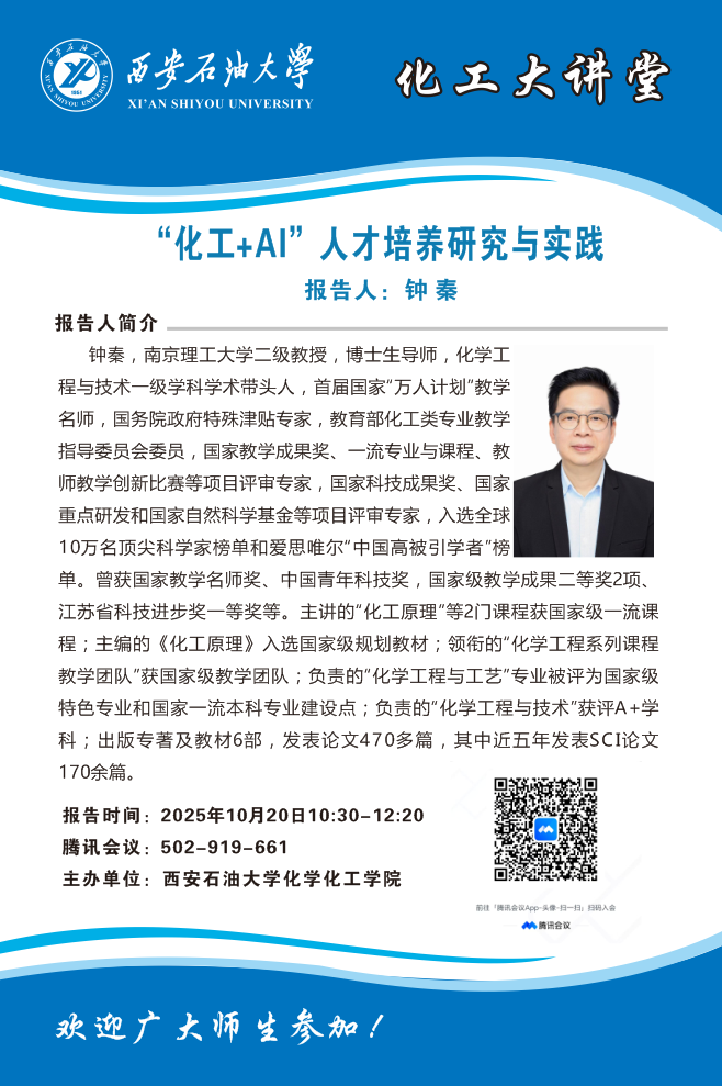 為深入探索人工智能時代化工專業(yè)與課程建設(shè)的新路徑與新方法,10月20上午化學(xué)化工學(xué)院化工大講堂”特邀南京理工大學(xué)二級教授、國家級教學(xué)名師鐘秦教授通過騰訊會議線上開展題為“化工+AI人才培養(yǎng)研究與實(shí)踐”的專題報告。報告化學(xué)化工學(xué)院黨委書記孫會珠主持,化學(xué)化工學(xué)院學(xué)院師生代表近60人參加了報告會。