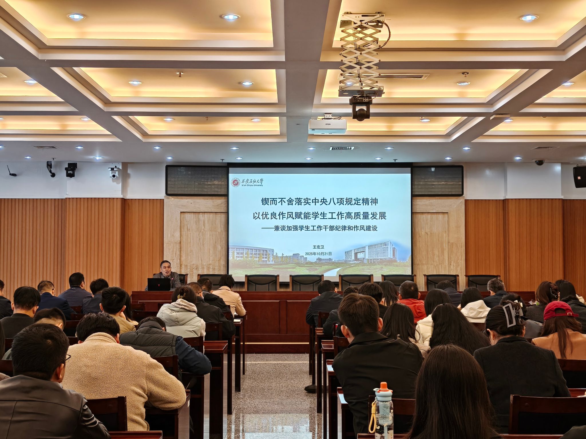 為深入落實中央八項規(guī)定精神,以優(yōu)良作風賦能學生工作高質量發(fā)展,進一步強化學工干部紀律作風建設與立德樹人履職盡責能力,2025年10月21日下午,學生工作部在鄠邑校區(qū)第一會議室舉辦“鐵人式”學工干部專題培訓第六講。校紀委副書記王宏衛(wèi)受邀作題為《鍥而不舍落實中央八項規(guī)定精神,以優(yōu)良作風賦能學生工作高質量發(fā)展》的專題報告,報告由學生工作部副部長畢軼慧主持,全體學工干部參加。