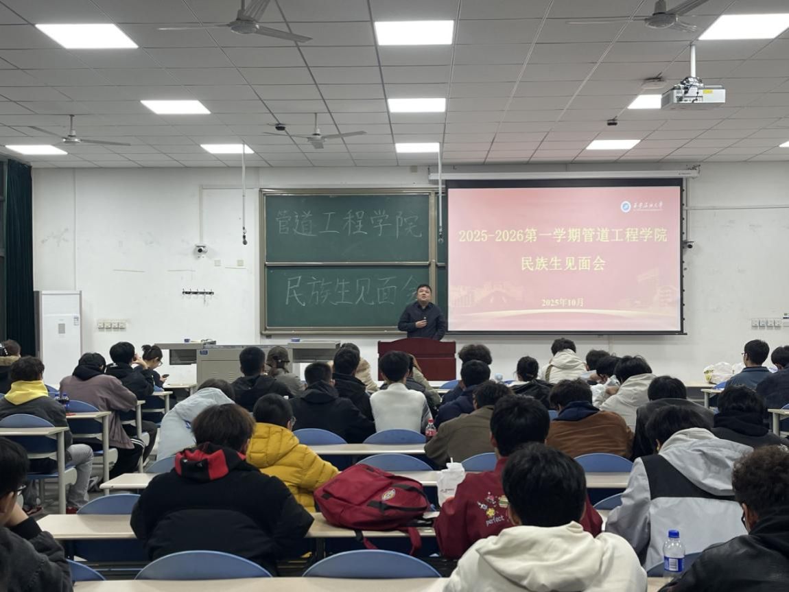 為鑄牢中華民族共同體意識(shí),提升少數(shù)民族學(xué)生工作成效,10月22日晚,管道工程學(xué)院在鄠邑校區(qū)博思樓B105舉行了2025-2026學(xué)年第一學(xué)期少數(shù)民族生交流會(huì)。學(xué)院黨委副書(shū)記高亮、2022級(jí)輔導(dǎo)員奴麗艷木·夏甫開(kāi)提、全院117位來(lái)自維吾爾族、藏族、回族等多個(gè)民族的學(xué)生參加交流會(huì)。