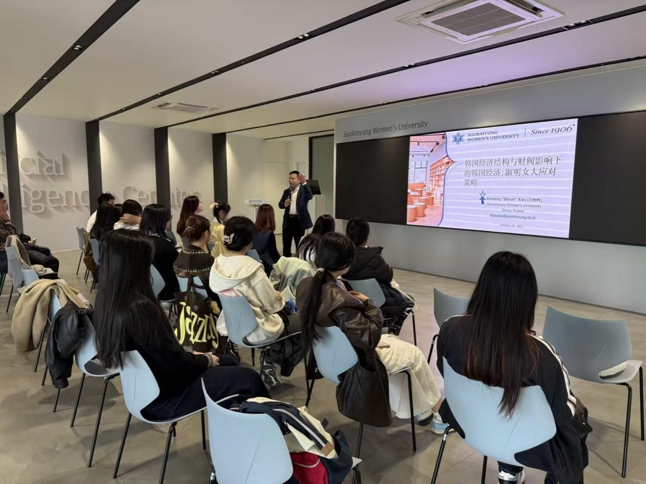 在淑明女子大學(xué)的學(xué)術(shù)交流環(huán)節(jié),研習(xí)團(tuán)師生深入?yún)⑴c了多場(chǎng)高水平專題講座。肖樹峰教授主講的《韓國(guó)經(jīng)濟(jì)結(jié)構(gòu)與財(cái)閥影響下的韓國(guó)經(jīng)濟(jì):淑明女子應(yīng)對(duì)策略》,從全球經(jīng)濟(jì)格局的宏觀視角切入,詳細(xì)解析了韓國(guó)經(jīng)濟(jì)的發(fā)展歷程、產(chǎn)業(yè)結(jié)構(gòu)特征及其在全球價(jià)值鏈中的定位。講座聚焦三星、現(xiàn)代、SK等財(cái)閥集團(tuán)對(duì)韓國(guó)經(jīng)濟(jì)生態(tài)的深遠(yuǎn)影響,引發(fā)了師生對(duì)新興經(jīng)濟(jì)體發(fā)展模式的深入思考。