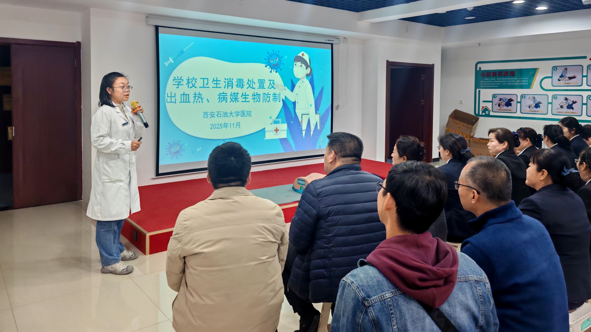 為全面提升校園應(yīng)急保障能力,筑牢師生生命安全防線,夯實(shí)幸福西石大建設(shè)的安全根基,推動(dòng)第三批“急救校園”建設(shè)落地見(jiàn)效,2025年11月5日下午,西安市鄠邑區(qū)紅十字會(huì)、校工會(huì)與校醫(yī)院聯(lián)合開(kāi)展第二期教職工應(yīng)急救護(hù)專項(xiàng)培訓(xùn),40余名教職工(以后勤工作人員為主)踴躍參與,以專業(yè)賦能注入安全動(dòng)能。同步開(kāi)展學(xué)校衛(wèi)生消毒處置及出血熱、病媒生物防治科普講座,以專業(yè)賦能全方位筑牢校園安全防線。