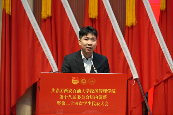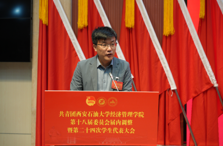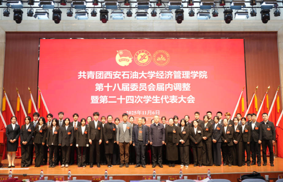 2025年11月6日,共青團(tuán)西安石油大學(xué)經(jīng)濟(jì)管理學(xué)院第十八屆委員會(huì)屆內(nèi)調(diào)整暨第二十四次學(xué)生代表大會(huì)在鄠邑校區(qū)弘石學(xué)術(shù)報(bào)告廳順利召開。學(xué)院黨委書記談建勤、校團(tuán)委書記王剛、經(jīng)濟(jì)管理學(xué)院黨委副書記趙紀(jì)飛、經(jīng)濟(jì)管理學(xué)院團(tuán)委書記張碩、學(xué)院各年級(jí)團(tuán)總支書記、輔導(dǎo)員以及各兄弟院系學(xué)生會(huì)主席團(tuán)代表、學(xué)院學(xué)生代表200余人參加了此次會(huì)議。