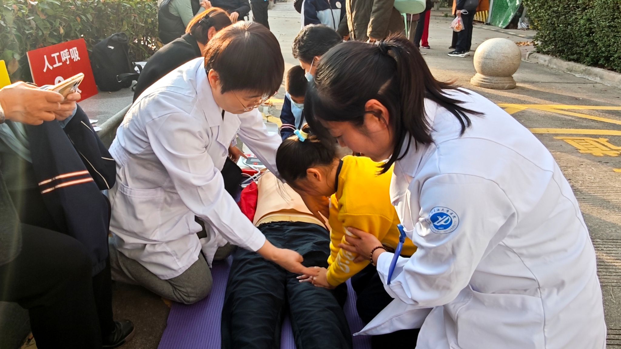 為提升校園應(yīng)急救護(hù)能力,校醫(yī)院護(hù)理部急救師資團(tuán)隊(duì)在兩場(chǎng)活動(dòng)中同步開展應(yīng)急救護(hù)實(shí)操培訓(xùn)。借助模擬人教具,重點(diǎn)演示心肺復(fù)蘇(CPR)、自動(dòng)體外除顫儀(AED)操作及海姆立克急救法,將專業(yè)操作拆解為清晰步驟,采用“理論講解+模擬實(shí)操”相結(jié)合的方式授課。