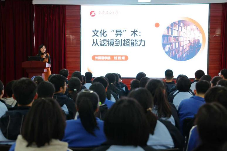 劉西娟老師為學(xué)生們作了題為《文化“異”術(shù):從濾鏡到超能力》的專題講座。她從文化意識(shí)的培養(yǎng)出發(fā),引導(dǎo)學(xué)生打破刻板印象,以多元視角理解世界,深入分析不同文化背景下的思維差異。