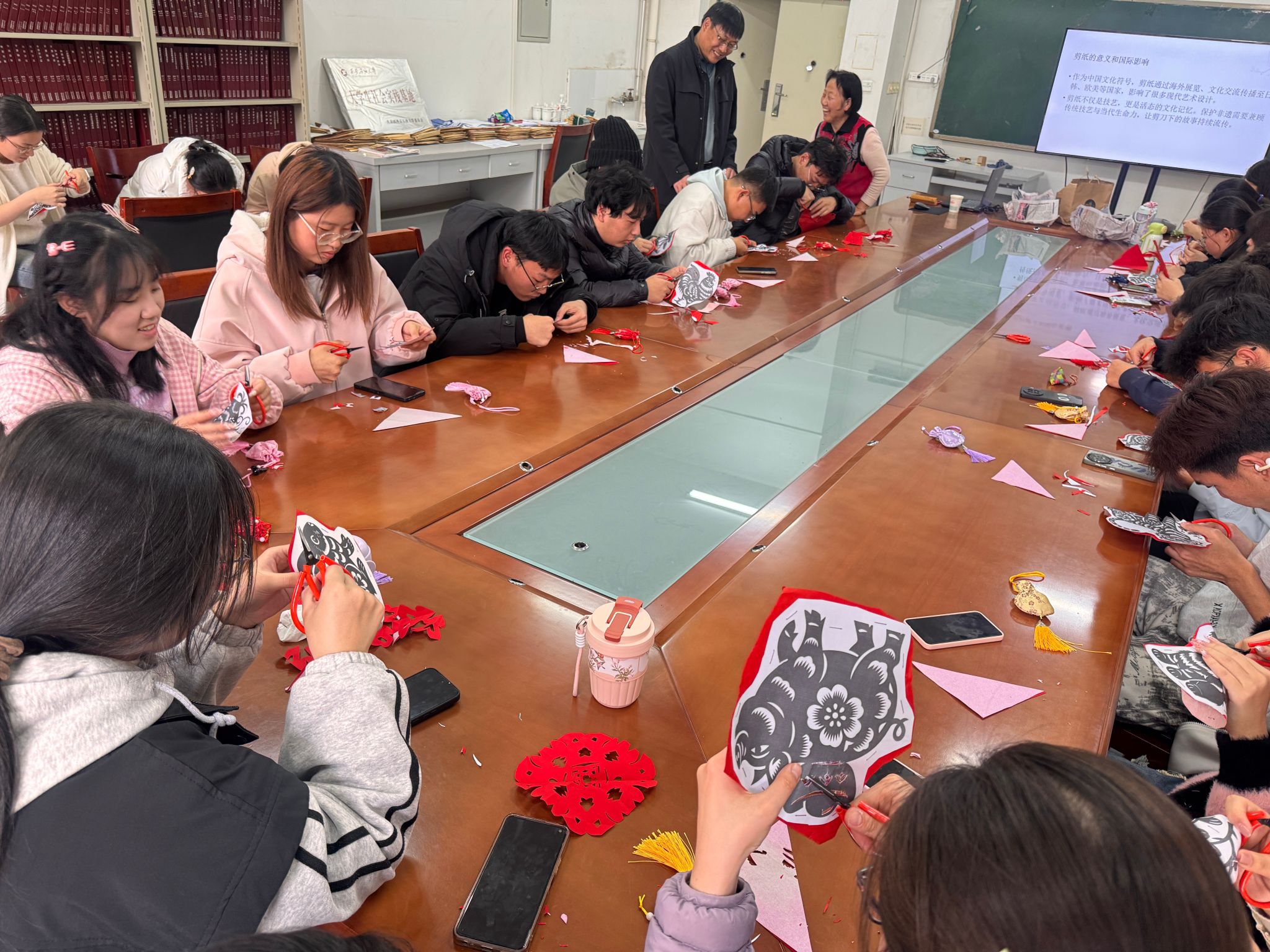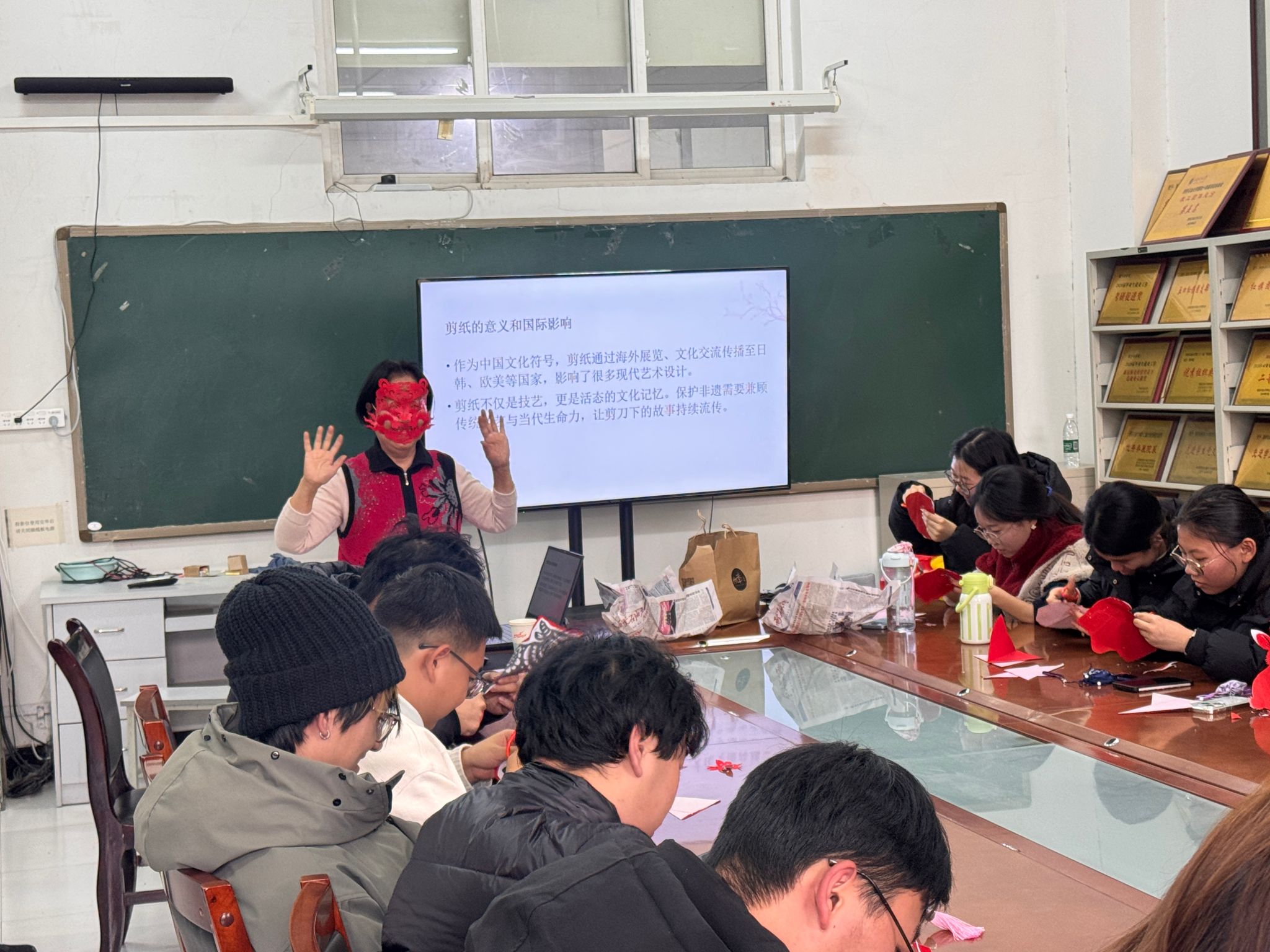 活動(dòng)現(xiàn)場,78歲的肖志賢老人以輕松幽默的語言和深入淺出的講解,為同學(xué)們系統(tǒng)梳理了剪紙藝術(shù)的起源、內(nèi)容與地域特色。從吉祥文字到神話傳說,從十二生肖到花鳥蟲魚,她不僅生動(dòng)解讀了剪紙背后的民俗信仰與生命禮俗,更以“諧音象征”為例,巧妙串聯(lián)起中國人的生活哲學(xué)與樂觀智慧。講解過程中,金句頻出、妙趣橫生,引得現(xiàn)場笑聲不斷,掌聲迭起。