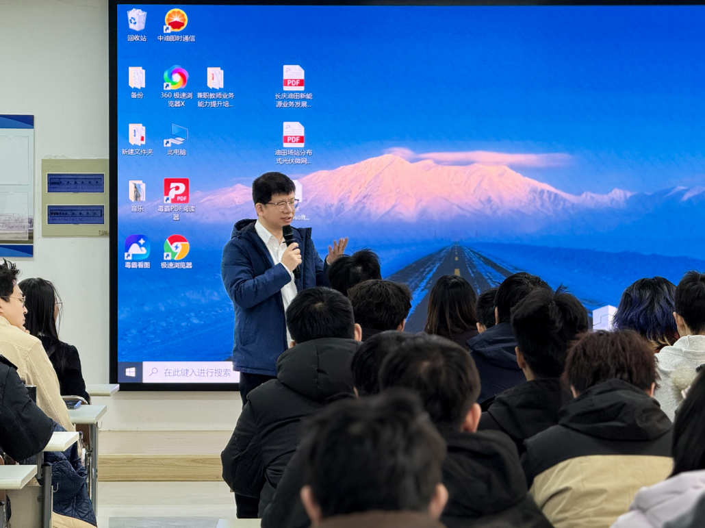 在座談會(huì)上,校友蔣守強(qiáng)以長(zhǎng)慶油田新能源業(yè)務(wù)發(fā)展及項(xiàng)目管理為題就油氣與新能源融合技術(shù)的現(xiàn)場(chǎng)應(yīng)用為同學(xué)們做了介紹。新能源學(xué)院副院長(zhǎng)張明從圍繞“什么是新能源”“國(guó)家為什么要發(fā)展新能源”“油田企業(yè)新能源應(yīng)用發(fā)展趨勢(shì)”等三個(gè)問題展開系統(tǒng)講授,讓同學(xué)們了解到相較傳統(tǒng)能源新能源的發(fā)展優(yōu)勢(shì)、當(dāng)前國(guó)際國(guó)內(nèi)形勢(shì)下國(guó)家發(fā)展新能源的必要性以及未來油田企業(yè)對(duì)新能源人才的需求等。隨后研究生們圍繞油氣行業(yè)發(fā)展趨勢(shì)、長(zhǎng)慶油田對(duì)人才的招聘需求以及個(gè)人在油氣行業(yè)的未來發(fā)展與蔣守強(qiáng)校友及張明副院長(zhǎng)進(jìn)行了互動(dòng)交流,現(xiàn)場(chǎng)氣氛熱烈。