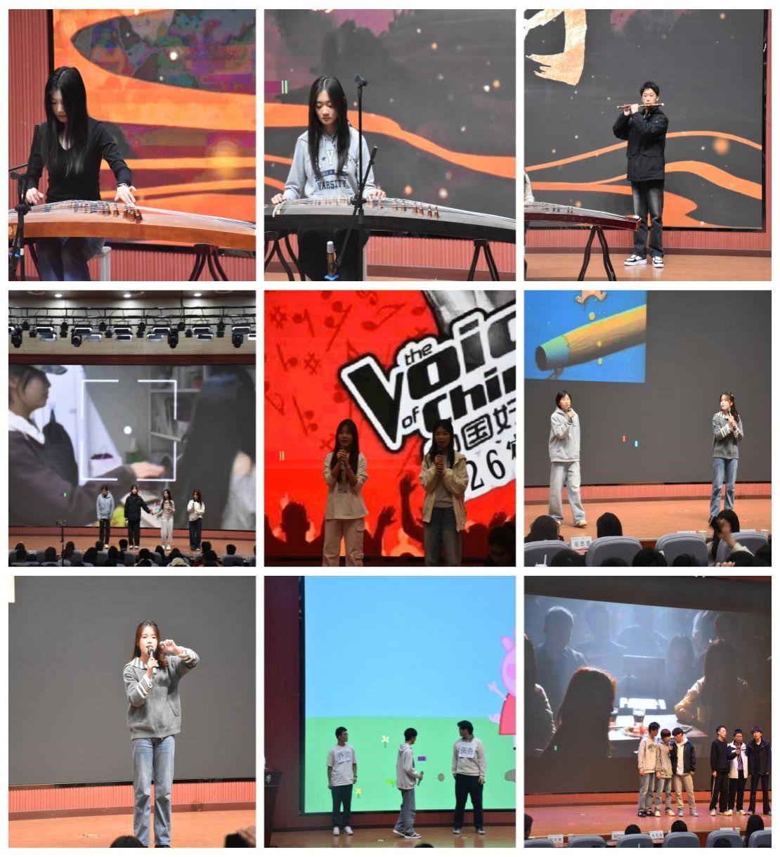 表彰環(huán)節(jié)結(jié)束后,獲獎宿舍分別展示了各自的豐碩成果。民樂合奏《象王行》先聲奪人,氛圍瞬間點(diǎn)燃;五個宿舍依次登臺展示了各具特色的舍徽設(shè)計(jì)歷程,從理念構(gòu)思到視覺成型,每一處細(xì)節(jié)都凝聚著同學(xué)們的巧思與團(tuán)隊(duì)智慧;手抄報作品《雅室生輝》,通過圖文并茂的形式,生動詮釋了宿舍文化的內(nèi)涵,彰顯出深厚的情感寄托與人文意趣;宿舍成員合唱《一笑傾城》、《愛錯》、《成都》,以歌聲傳遞出室友間的溫情與默契;宿舍主題演講《屋檐下的星光》《致635的我們》,真摯表達(dá)了同學(xué)們對宿舍生活的深厚情感與美好期盼;舞臺劇《宿舍好聲音》、英語表演《Muddy Puddles》及微電影《629“甄嬛傳之曠課風(fēng)波》,則憑借生動演繹與巧妙創(chuàng)意,將現(xiàn)場氣氛推向高潮,笑聲掌聲不絕。