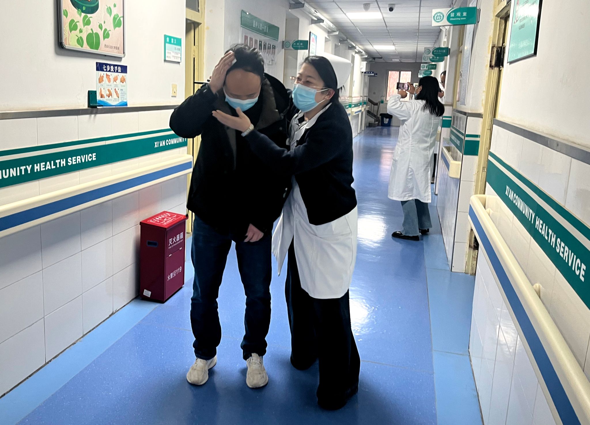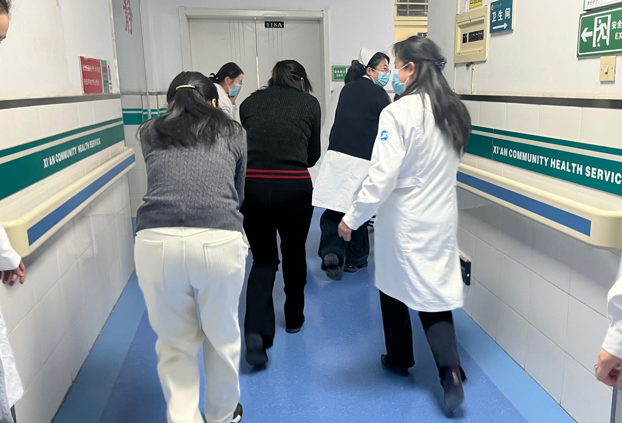 與此同時,疏散引導(dǎo)人員快速打開安全出口,引導(dǎo)就診患者及醫(yī)護(hù)人員用濕毛巾捂住口鼻,彎腰低姿沿預(yù)定疏散路線快速撤離。針對行動不便的模擬患者,工作人員采用攙扶、輪椅轉(zhuǎn)運(yùn)等方式全程協(xié)助,做到不推擠、不遺漏,確保所有人員在規(guī)定時間內(nèi)安全撤離至室外指定集合點,各小組隨即快速清點人數(shù)并向指揮部匯報。醫(yī)院應(yīng)急醫(yī)療小組同步在疏散現(xiàn)場搭建臨時救護(hù)點,丁麗團(tuán)隊全力協(xié)助醫(yī)療演練開展,配合做好救護(hù)物資轉(zhuǎn)運(yùn)、模擬患者傷情配合、救治現(xiàn)場輔助等工作,助力醫(yī)療小組高效完成傷口處理、吸氧、頭部包扎等緊急救治流程,充分彰顯醫(yī)療應(yīng)急處置的專業(yè)性與團(tuán)隊協(xié)作的高效性。