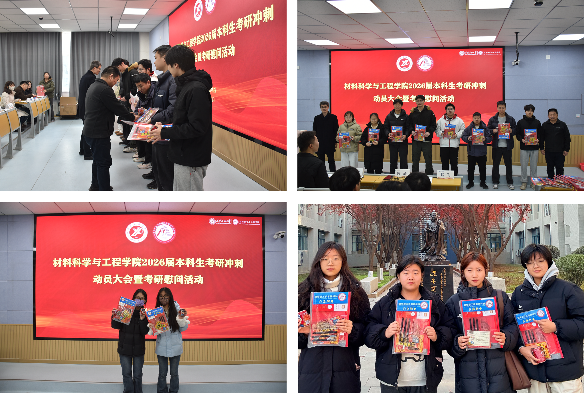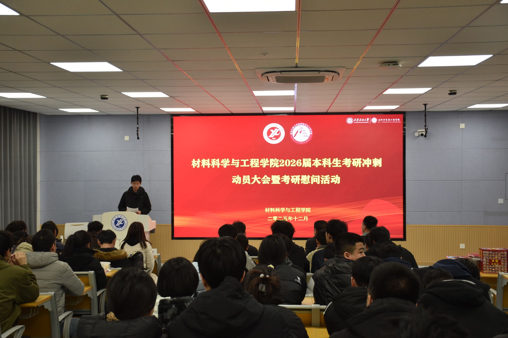 為深入貫徹“以生為本”育人理念,切實關(guān)懷考研學子備考狀態(tài),緩解備考壓力,增強迎考信心,12月4日,材料科學與工程學院在鄠邑校區(qū)博覽樓110教室舉行2026屆本科生考研沖刺動員大會暨考研慰問活動。學院黨委書記耿嶺,黨委副書記屈敏佳,各年級輔導(dǎo)員和2026屆考研學生100余人參加活動?;顒佑蓪W院學生工作辦公室副主任趙飛主持。