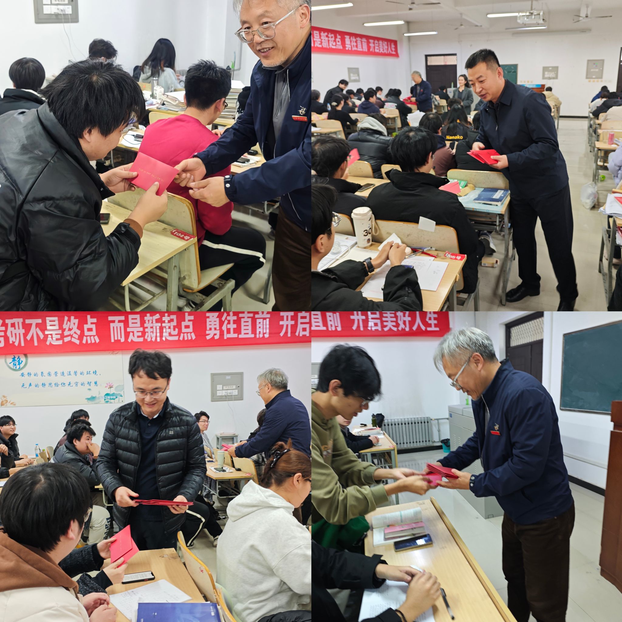 活動上,學院領導與老師們將飽含期許的禮物親手遞至備考學子手中,一封紅色信箋寄寓“鴻”運當頭之祝愿,封面“考研錦囊”字樣凝結(jié)智慧,封口處院徽如印,靜靜烙下學院的牽掛與囑托。考慮到考試期間通訊與用餐多有不便,學院特備暖心餐票,護航學子安心落筆,尤為珍貴的是,2026屆畢業(yè)班輔導員為每位考生親筆書寫信函,字里行間流淌真情,紙短情長蘊藏深意,讓溫暖的陪伴跨越考場內(nèi)外,成為每一位學子身后無聲卻堅實的港灣。