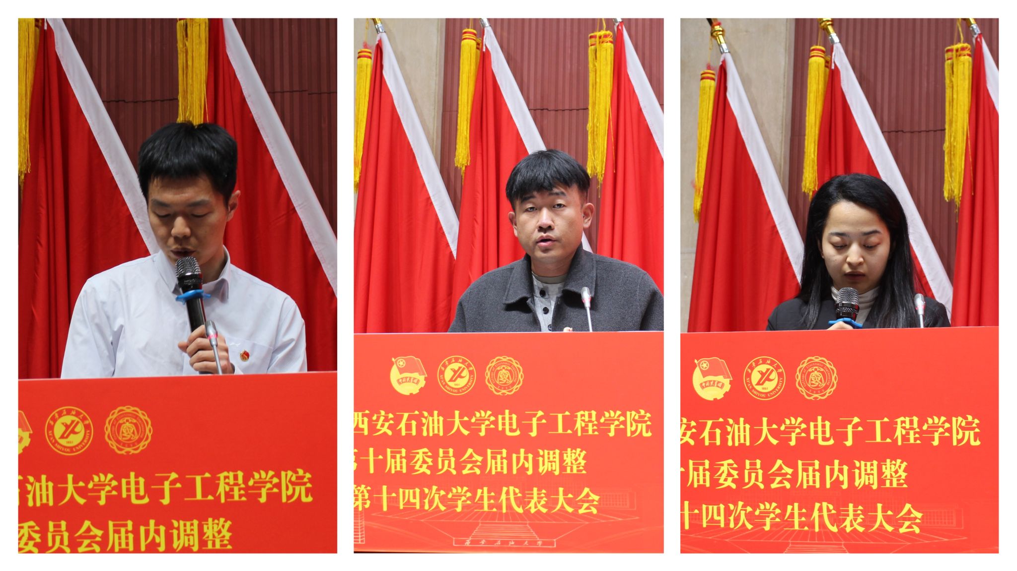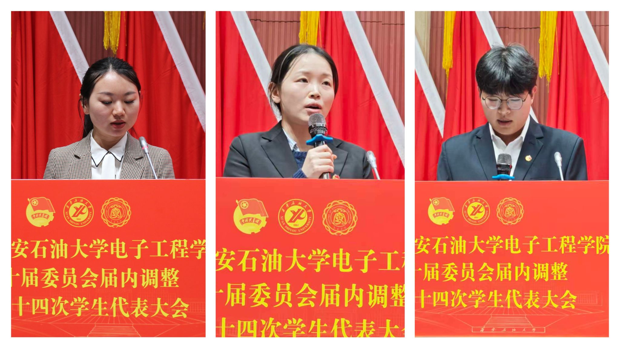 2023級團(tuán)總支書記張欣樂宣讀《共青團(tuán)西安石油大學(xué)電子工程學(xué)院第十屆委員會增補(bǔ)委員調(diào)整名單》,2022級團(tuán)總支書記張零宣讀《大會選舉辦法》,2024級團(tuán)總支書記帕麗達(dá)·托乎提宣讀《大會監(jiān)票人、計(jì)票人名單》。