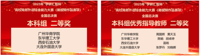 2025年12月27日,由中國國際貿易學會主辦,北京學研匯智網絡科技有限公司聯(lián)合主辦的第五屆“學研匯智杯”高校商務外語綜合能力大賽(微視頻作品賽項)(以下簡稱“大賽 ”)全國總決賽成功舉辦。我校共有4支隊伍晉級升級復賽,最終一支隊伍闖入全國總決賽并獲得第二名的好成績。