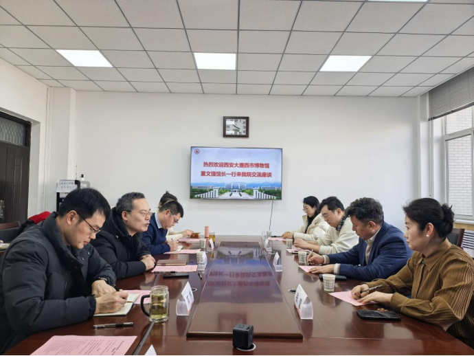 1月6日下午,西安大唐西市博物館館長(zhǎng)董文強(qiáng)一行5人蒞臨我院,開展座談交流。交流會(huì)在鄠邑校區(qū)崇文樓314會(huì)議室舉行,外國(guó)語(yǔ)學(xué)院黨政領(lǐng)導(dǎo)及師生代表參會(huì)。